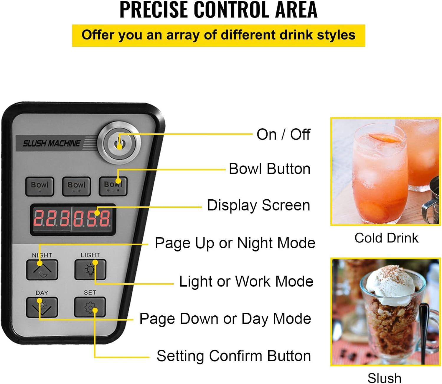 Precise Control Panel: Easy-to-use controls are intuitive and customizable enough to offer various drink styles. The slush and cold drink mode allows you to adjust the temperature and consistency until it is ideal. A mixing switch is designed to control the 360°rotating stirrer, avoiding the sediment down to the bottom of the tank and ensuring completely mixed smoothies.