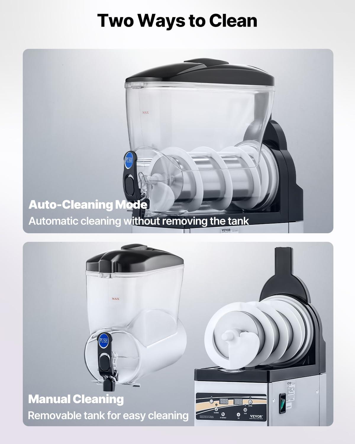 Durable & Easy to Clean: Made with a stainless steel body and food-grade PC tank, this commercial slushie machine is built to last and easy to clean. The tank features one-button automatic cleaning, and the modular components can be easily disassembled without tools for hassle-free maintenance and cleaning.