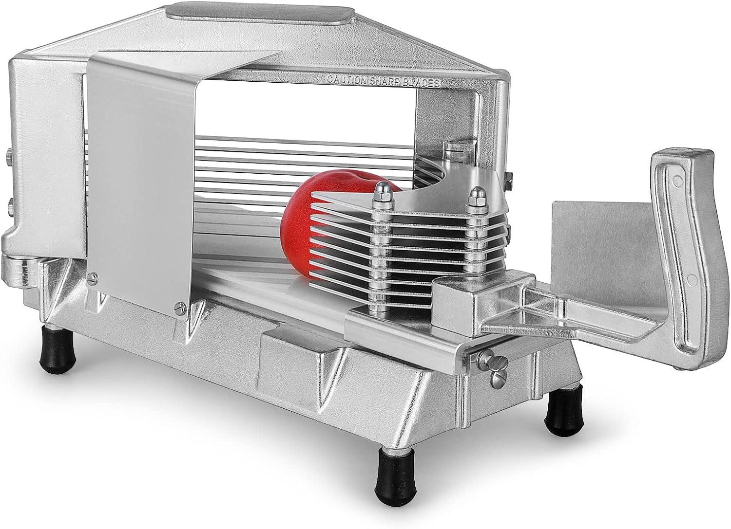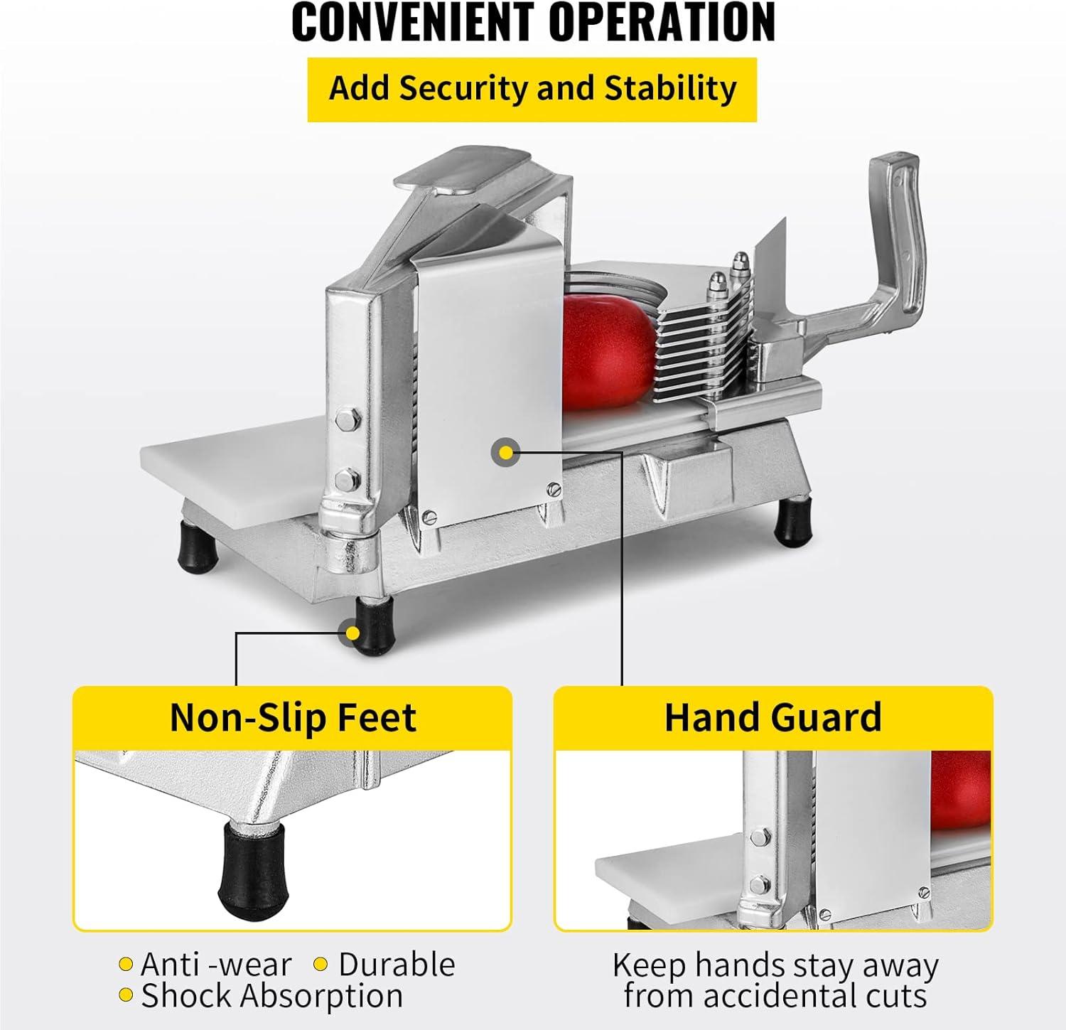 High Stability: Featuring a heavy-duty stainless steel body and 4 suction cup feet, this commercial tomato slicer can adapt to various tabletop surfaces, protecting your countertops and ensuring the device stays in place for smoother slicing operations.