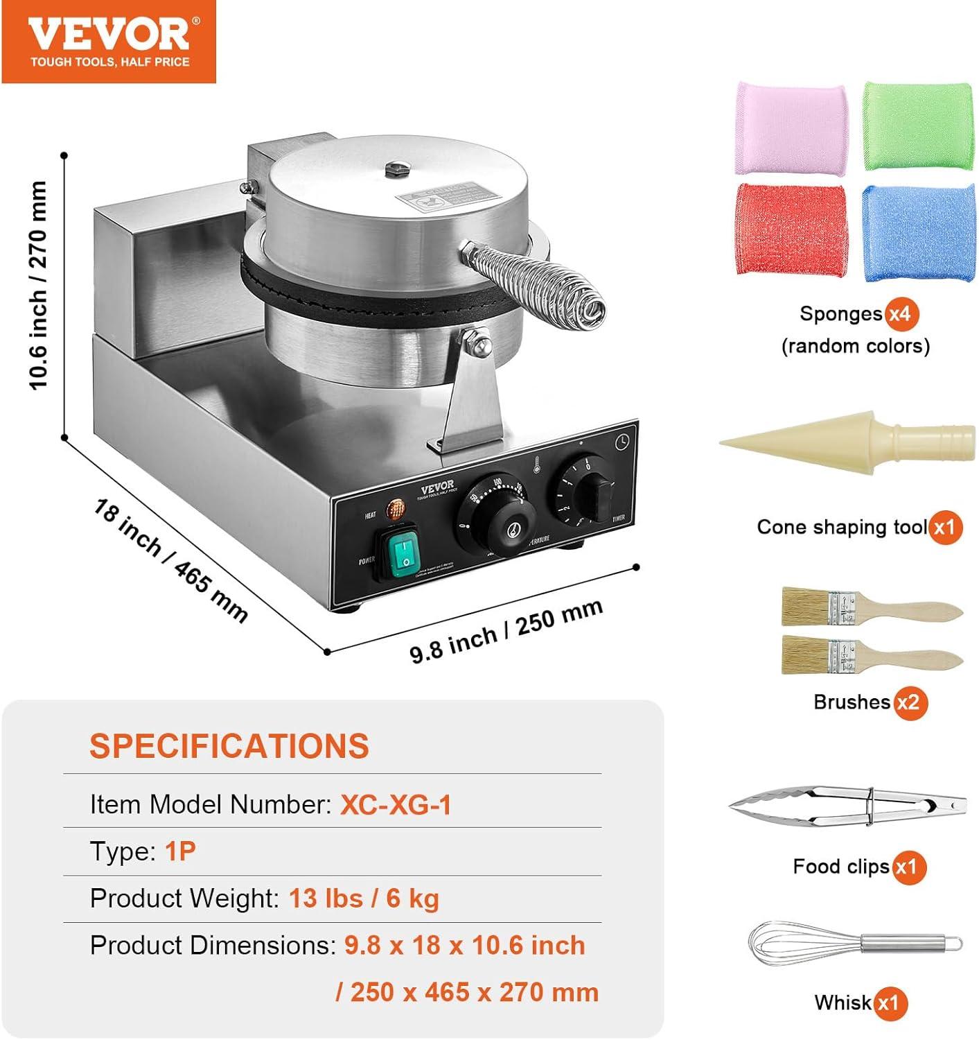 VEVOR Commercial Waffle Stick Maker, 6PCS 1500W Waffle Baker Machine, Non-Stick Stainless Steel Corn Hot Dog Waffle Iron with Temp and Time Control, Handle, for Restaurant Bakery Snack Bar Family(Ice Cream Cone)