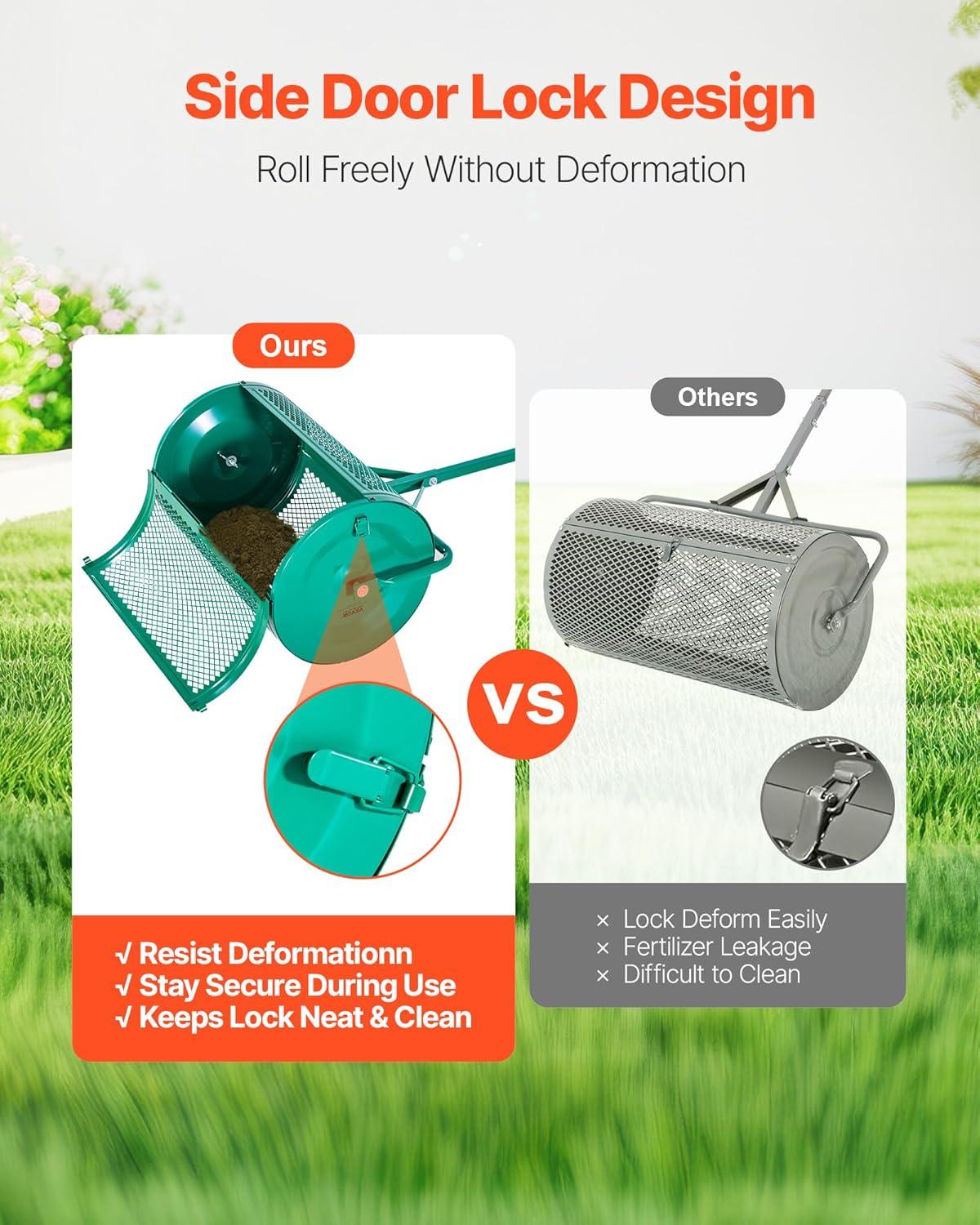Upgraded Side Latches: You will be in constant control while spreading compost! The peat moss roller is designed with two of the latest side latches that will not be crushed during rolling on the lawn. The unique design ensures the basket remains closed during tipping and tumbling operations, making it durable and tidy.