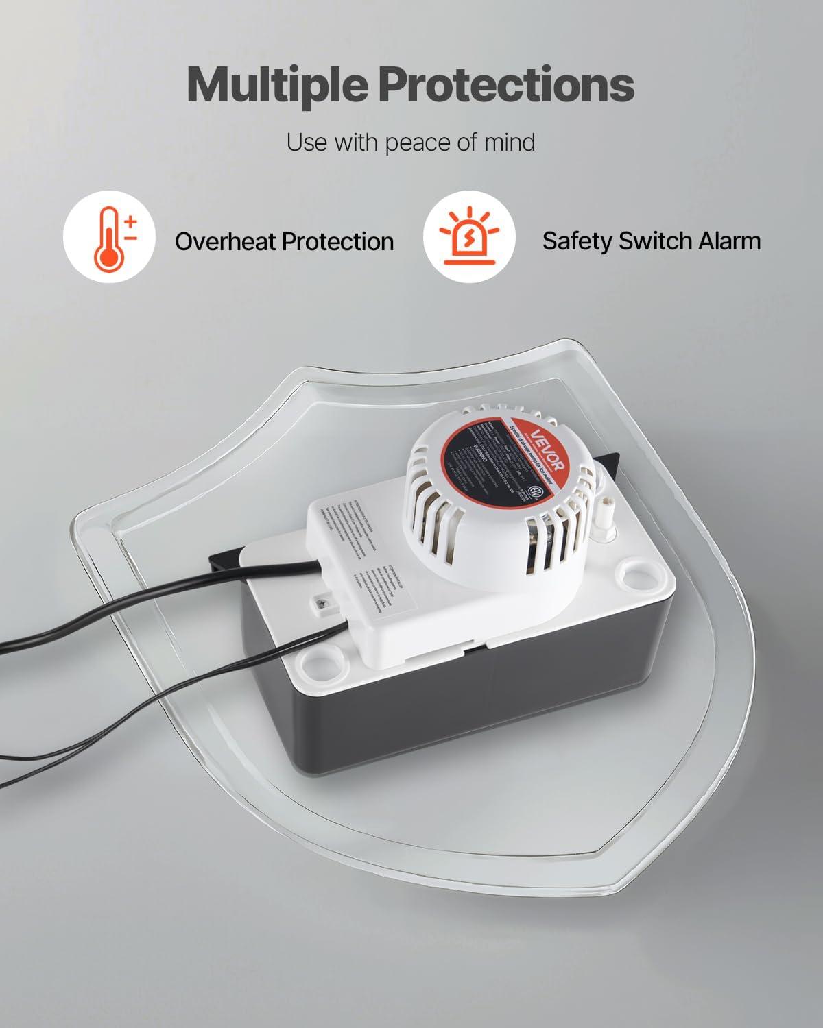 Security Comes First: The condensate pump is equipped with a security switch to turn off your air conditioner condenser or connect to an alarm. Once the pump malfunctions, it will sound an alarm to prevent the water tank from overflowing. The motor also has thermal overload protection to prevent burning out when overheating