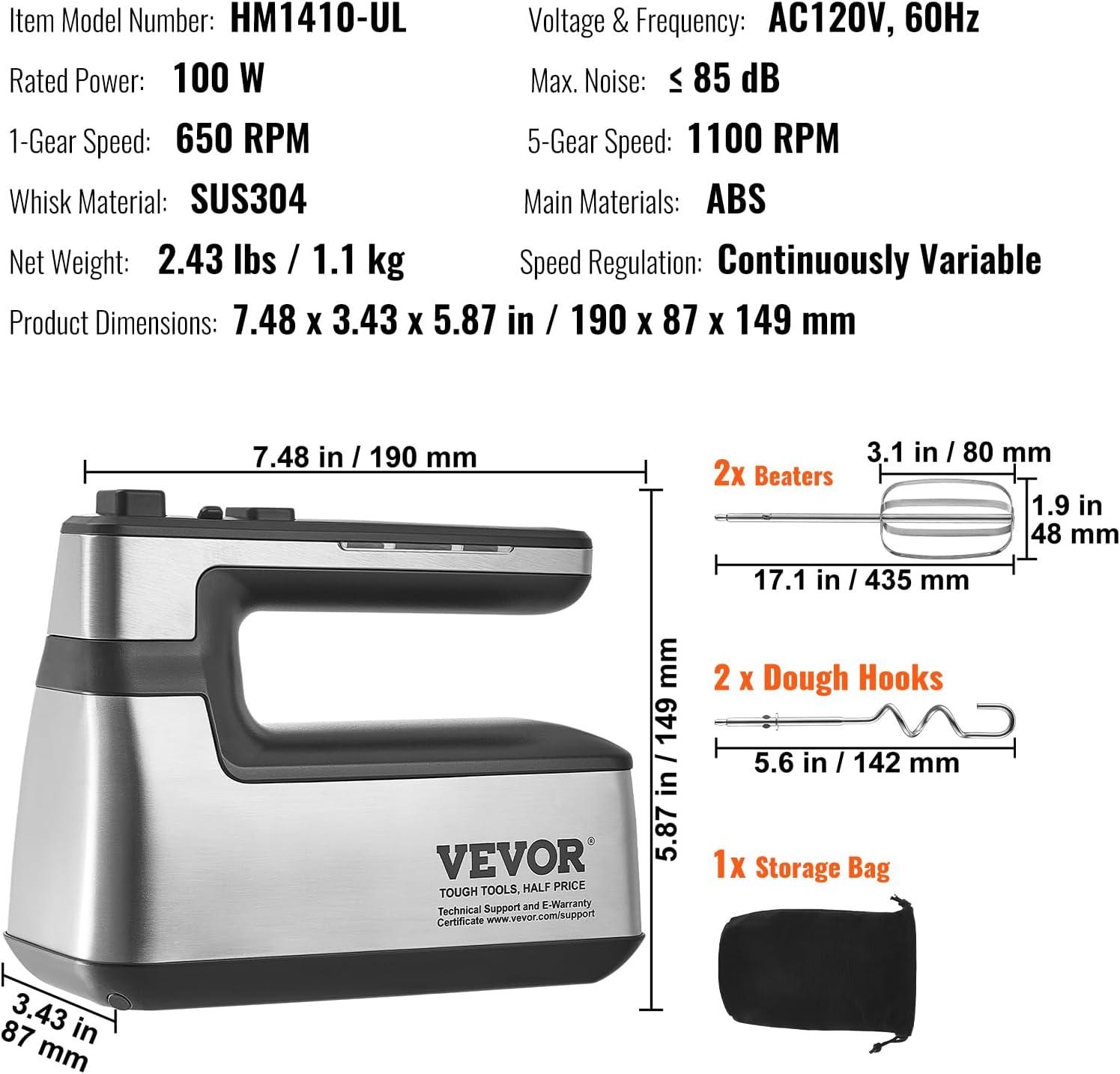 VEVOR Cordless Electric Hand Mixer,100W, Continuously Variable Electric Handheld Mixer, with Turbo Boost Beaters Dough Hooks Storage Bag, Baking Supplies for Whipping Mixing Egg Cookie Cake Cream(5-Speed,LCD)