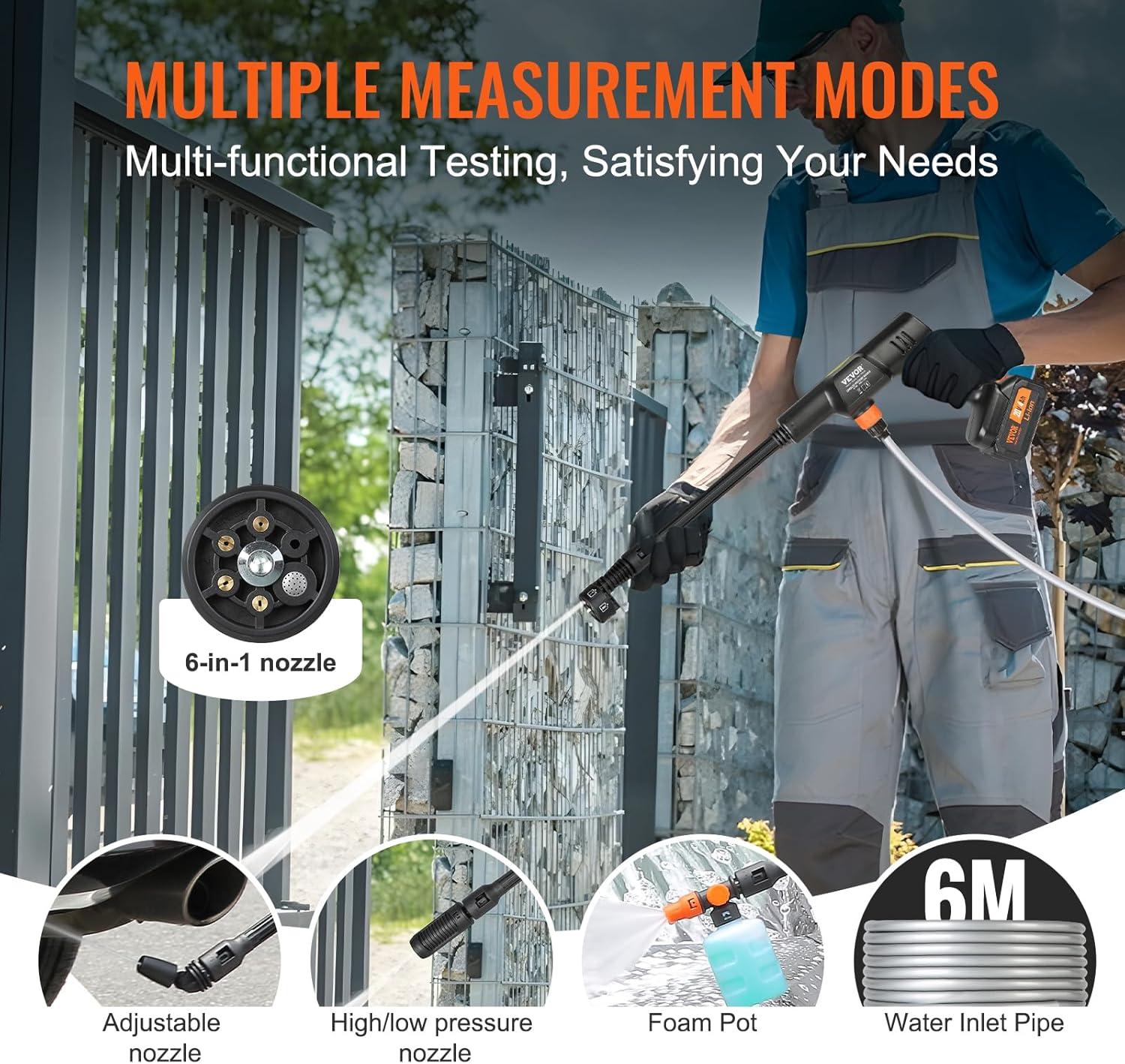 6-IN-1 NOZZLE, HIGH/LOW PRESSURE NOZZLE and 180° ROTATABLE NOZZLE:3 Different Spray Nozzles. 6-in-1 nozzle that is suitable for 0°, 15°, 25°, 40°, up mode, and shower mode. High/low pressure nozzle. And 180° rotatable nozzle, allows you to clean some difficult places, such as the car roof and underbody. It also includes a foam pot, suitable for watering or foam washing tasks.