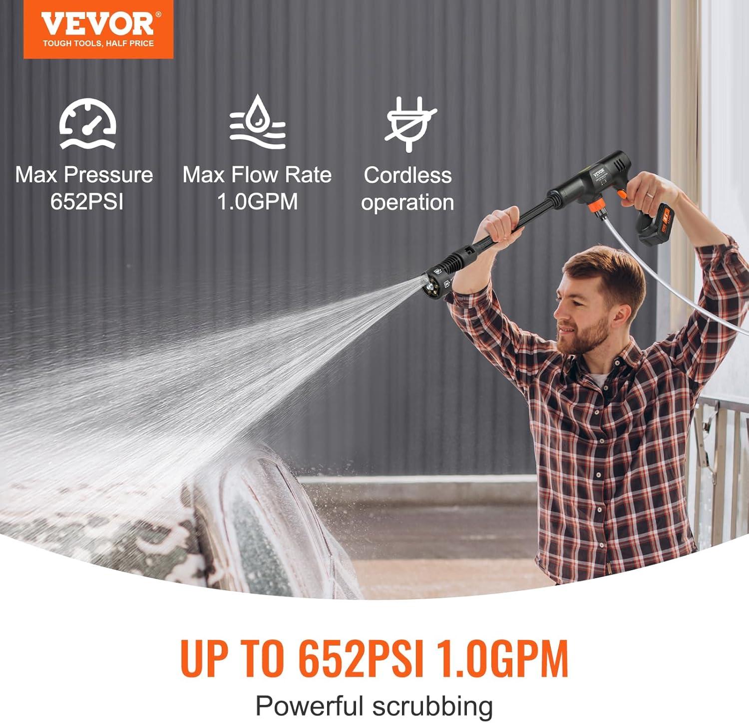 VEVOR Cordless Pressure Washer, 652-PSI 1.1 GPM Portable Power Cleaner, Handheld High-Pressure Car Washer Gun with 4.0Ah Battery, Charger, 6-in-1 Nozzle, for Home/Floor Cleaning & Watering(652 PSI)