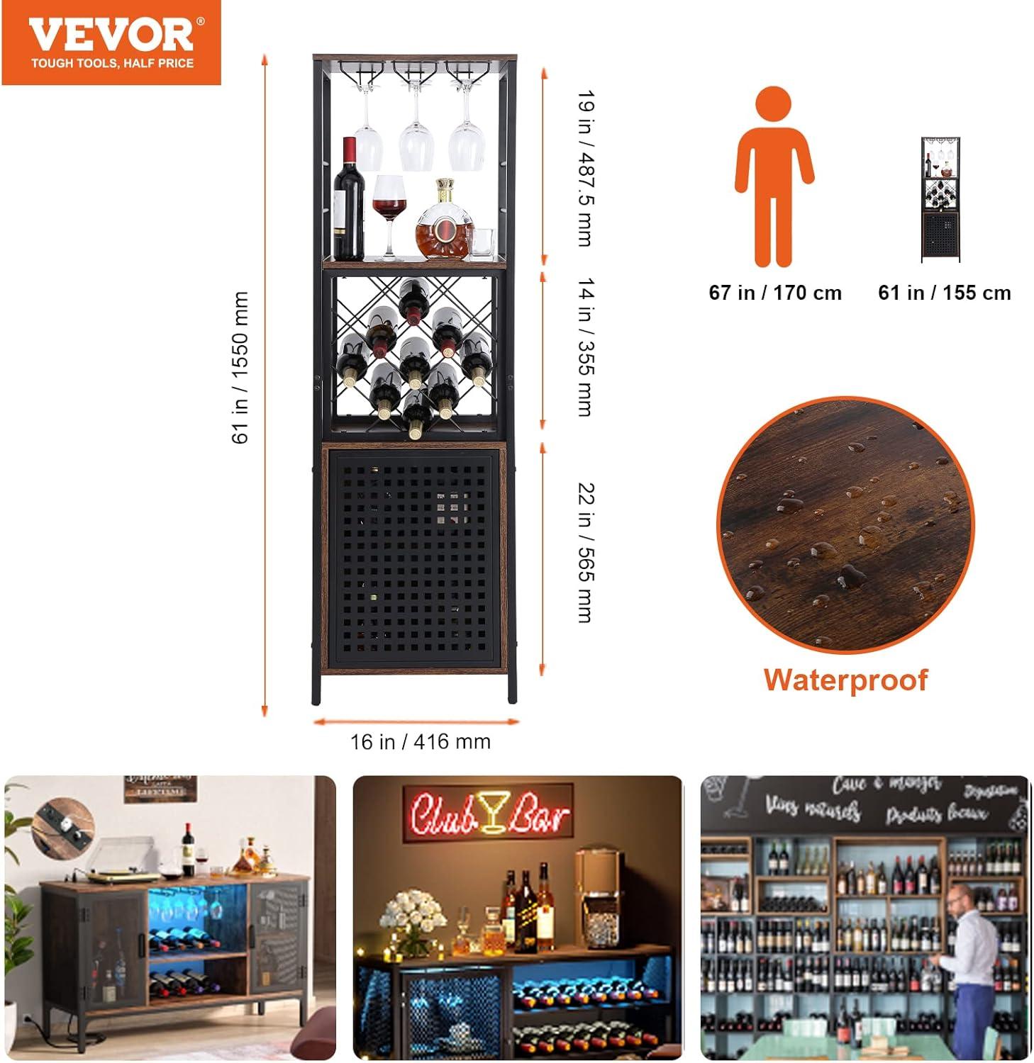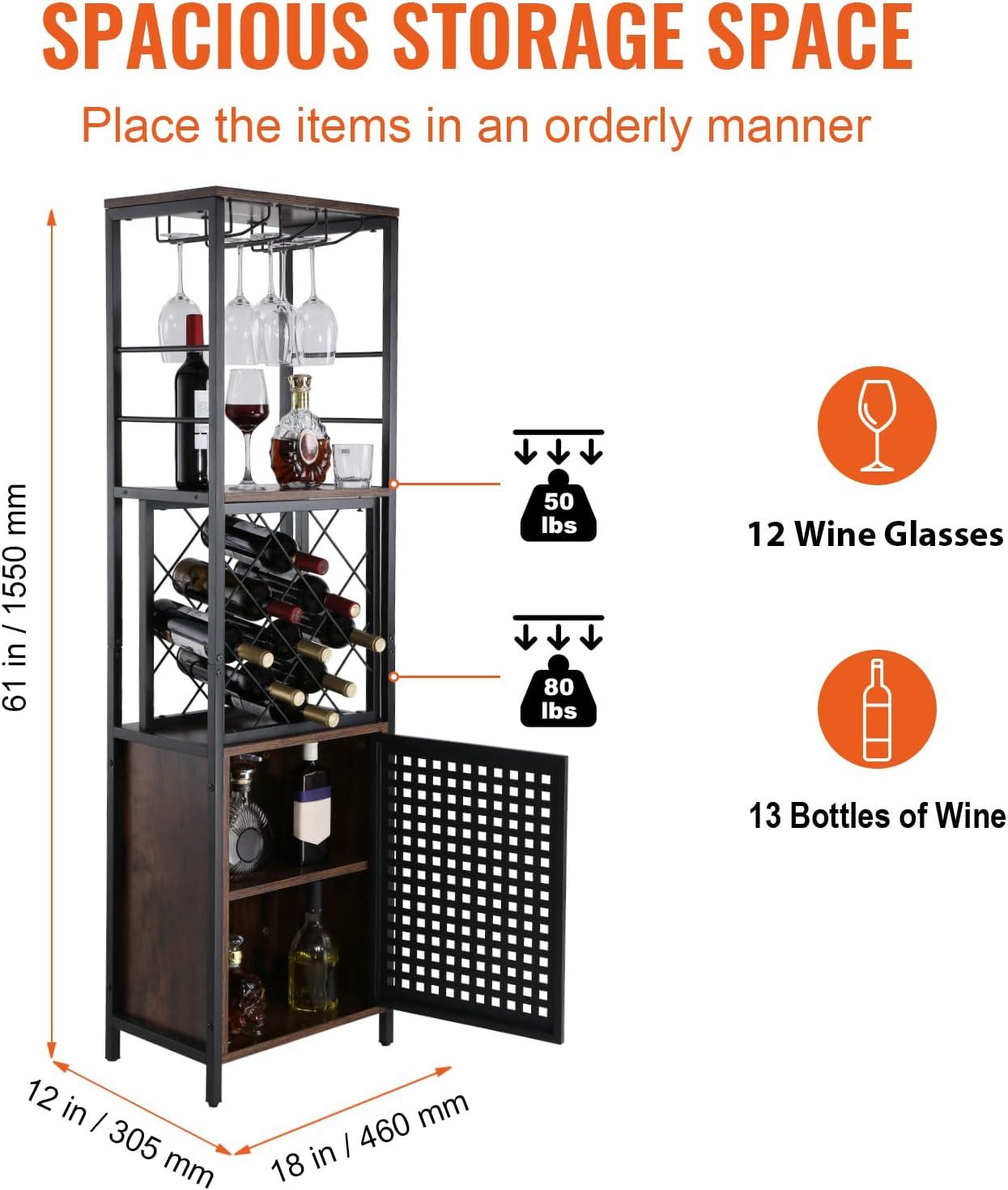 VEVOR Corner Industrial Bar Cabinet, Wine Table for Liquor & Glasses, Sideboard Buffet Cabinet with Glass Holder, Freestanding Farmhouse Wood Coffee Bar Cabinet for Living Room, Home Bar, Black Walnut(12″D x 18″W x 61″H)