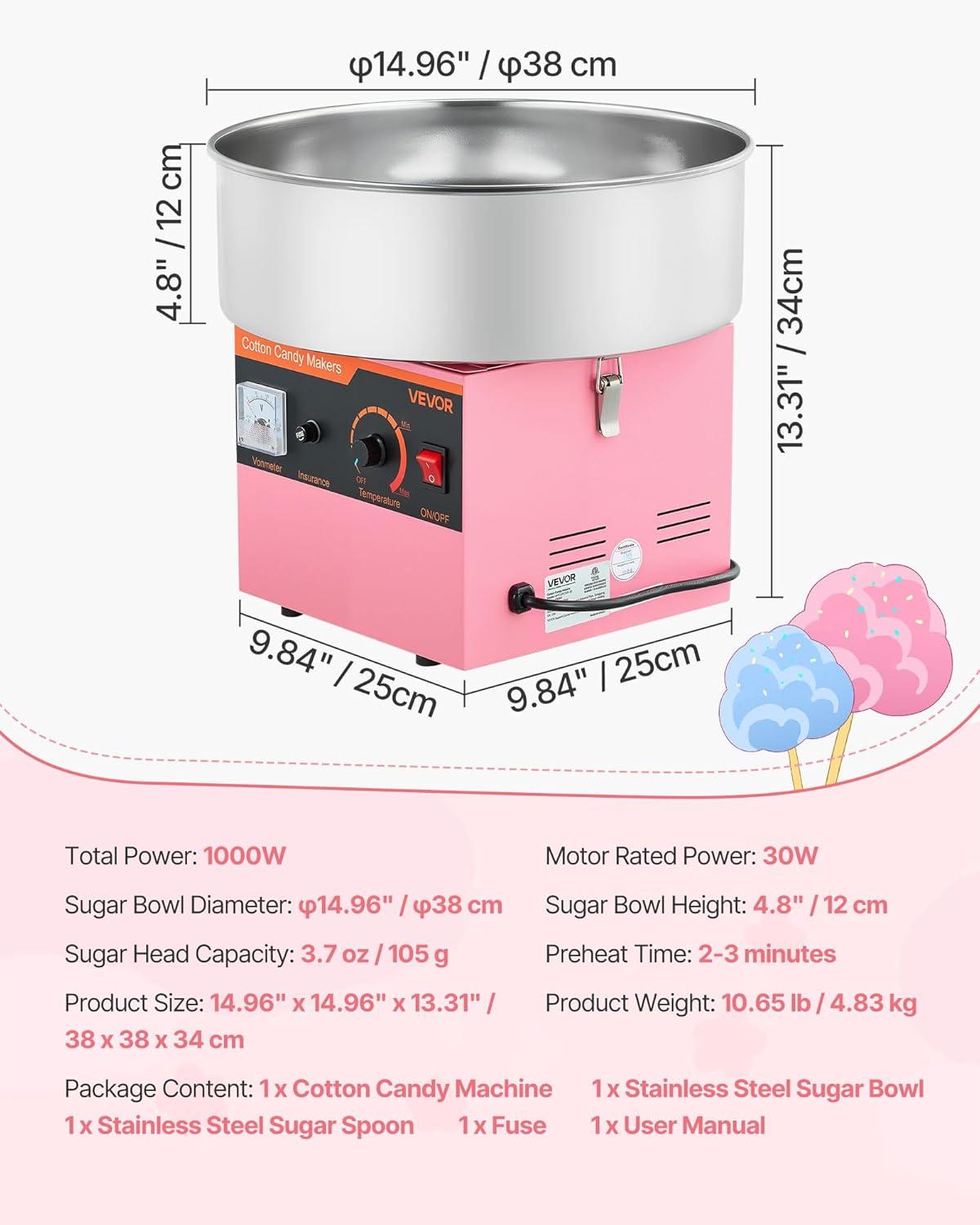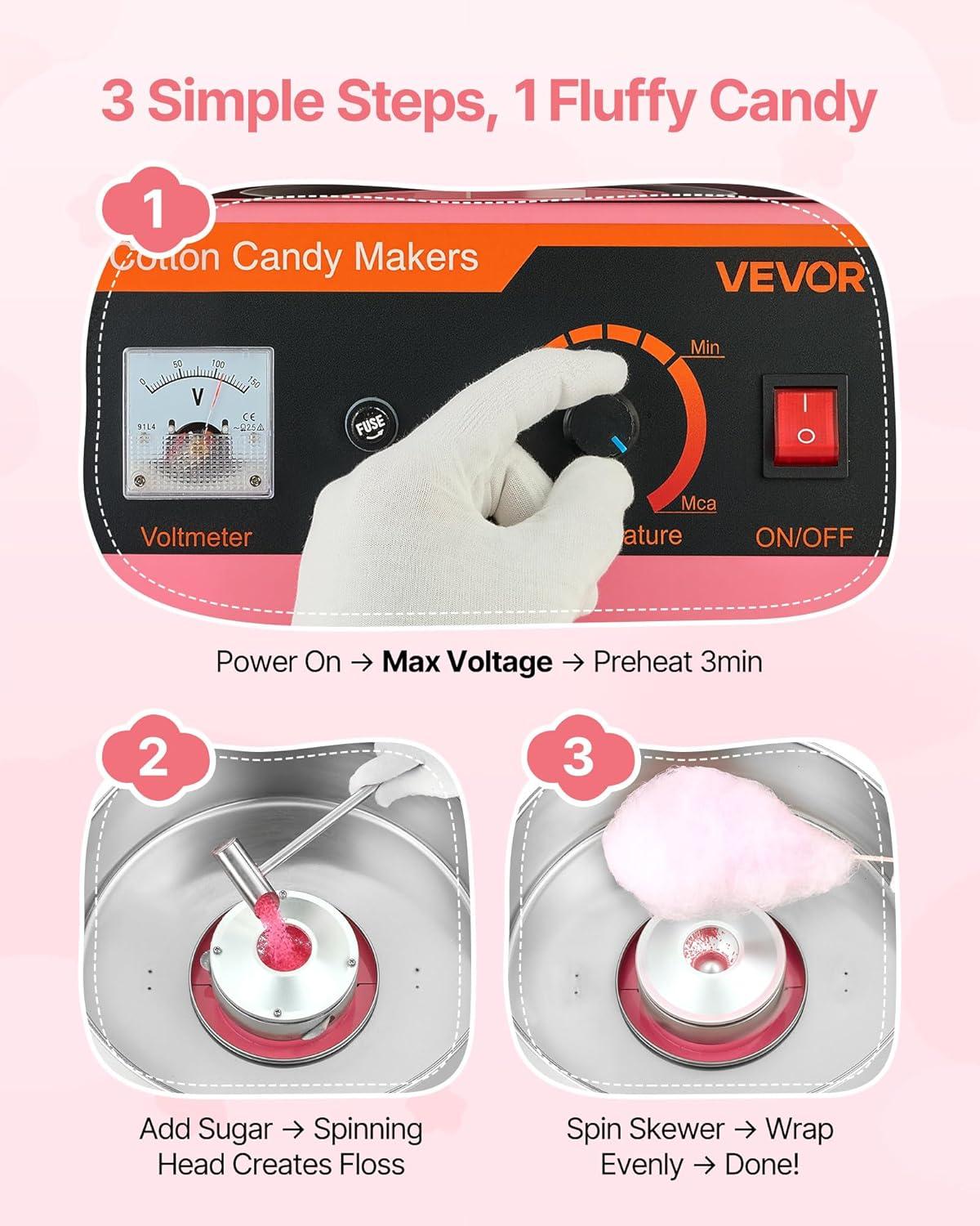 Smart Overheat Guard: Built-in thermostat provides overload/overheat shielding while the sugar head keeps spinning. It reduces malfunctions, and extends lifespan of electric cotton candy machine, ideal for home, parties, and small stalls