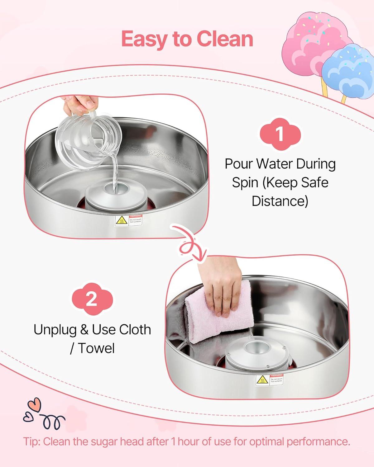 1-Minute Easy Cleanup: Pour water during operation (keep proper distance), sugar head spins to remove leftover. 1-minute cleanup after 1 hour of use—no tools needed, avoids part loss, keeps the candy floss maker ready for next use