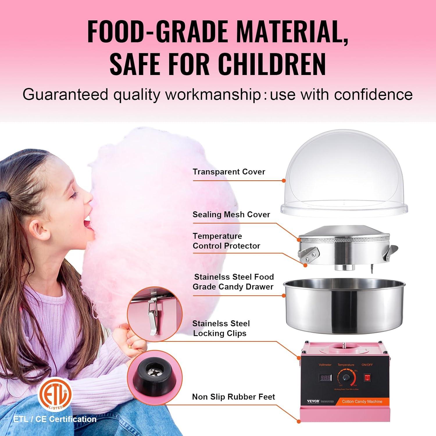 Work with Any Candy You Like: This cotton machine allows you to use the traditional flossing sugars, milk sugars, fruit cubes, or any of your favorite hard candies to make delicious cotton candies. With a compact size, it is suitable for countertop use, and it is perfect for carnivals, festivals, birthday parties, and sports events.