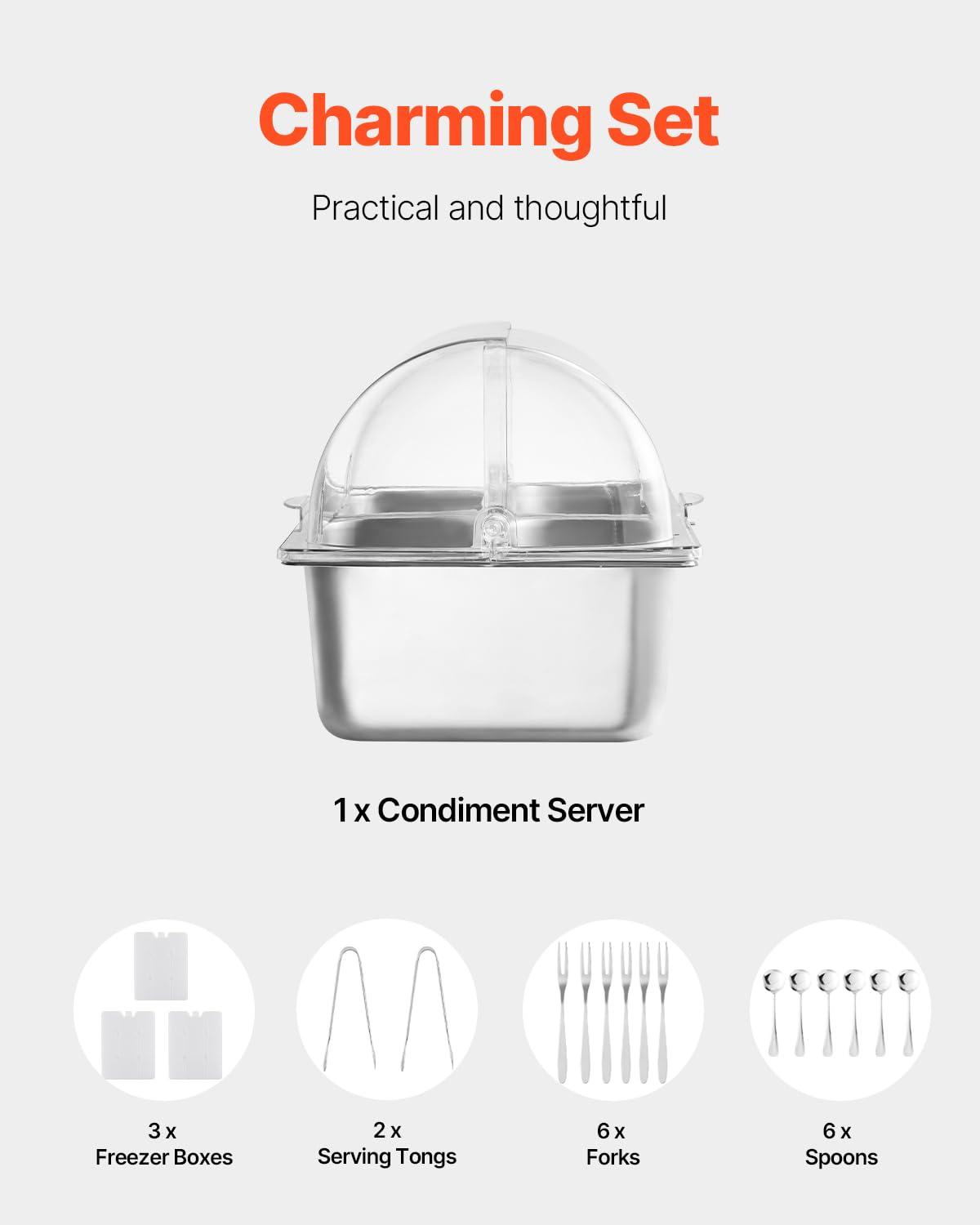 VEVOR Countertop Food Serving Display Container, 5 Pan Stainless Steel Food Serving Tray, Buffet Condiment Dispenser Display Rack with Clear Lid & 3 Freezer Boxes, for Restaurant Hotel Kitchen Party(4 Compartment)