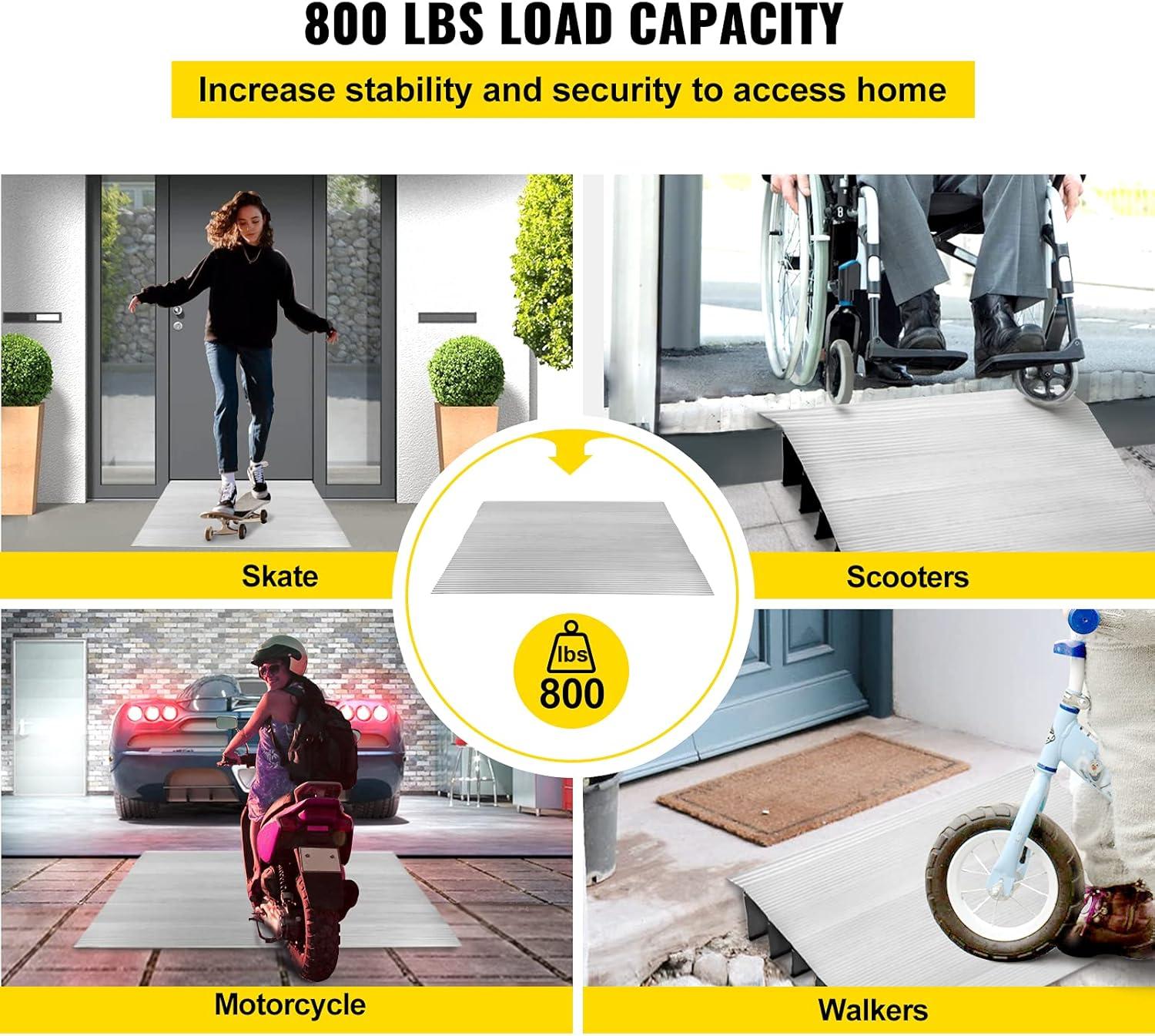 800 lbs Load Capacity: Thickness: 0.12″/ 3 mm. A heavy-duty aluminum threshold ramp can support up to 800 lbs/ 360 kg. Front edge feet of 7.87″/ 20 cm width can stably stand on the ground. Therefore, the ramp is great for the pass-by of wheelchairs, scooters, walkers, canes, and crutches.