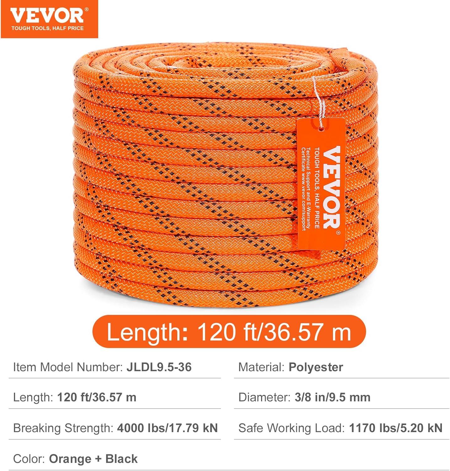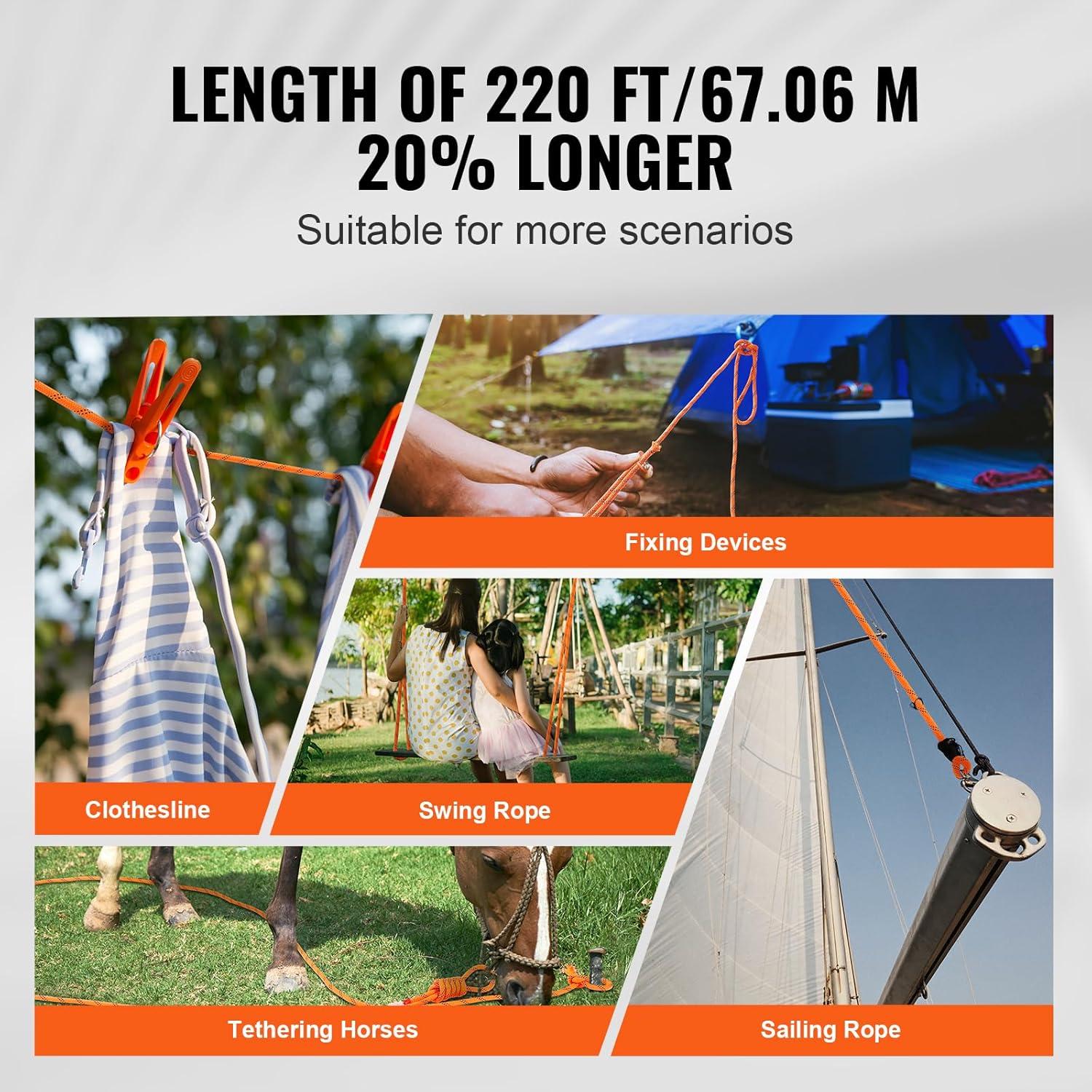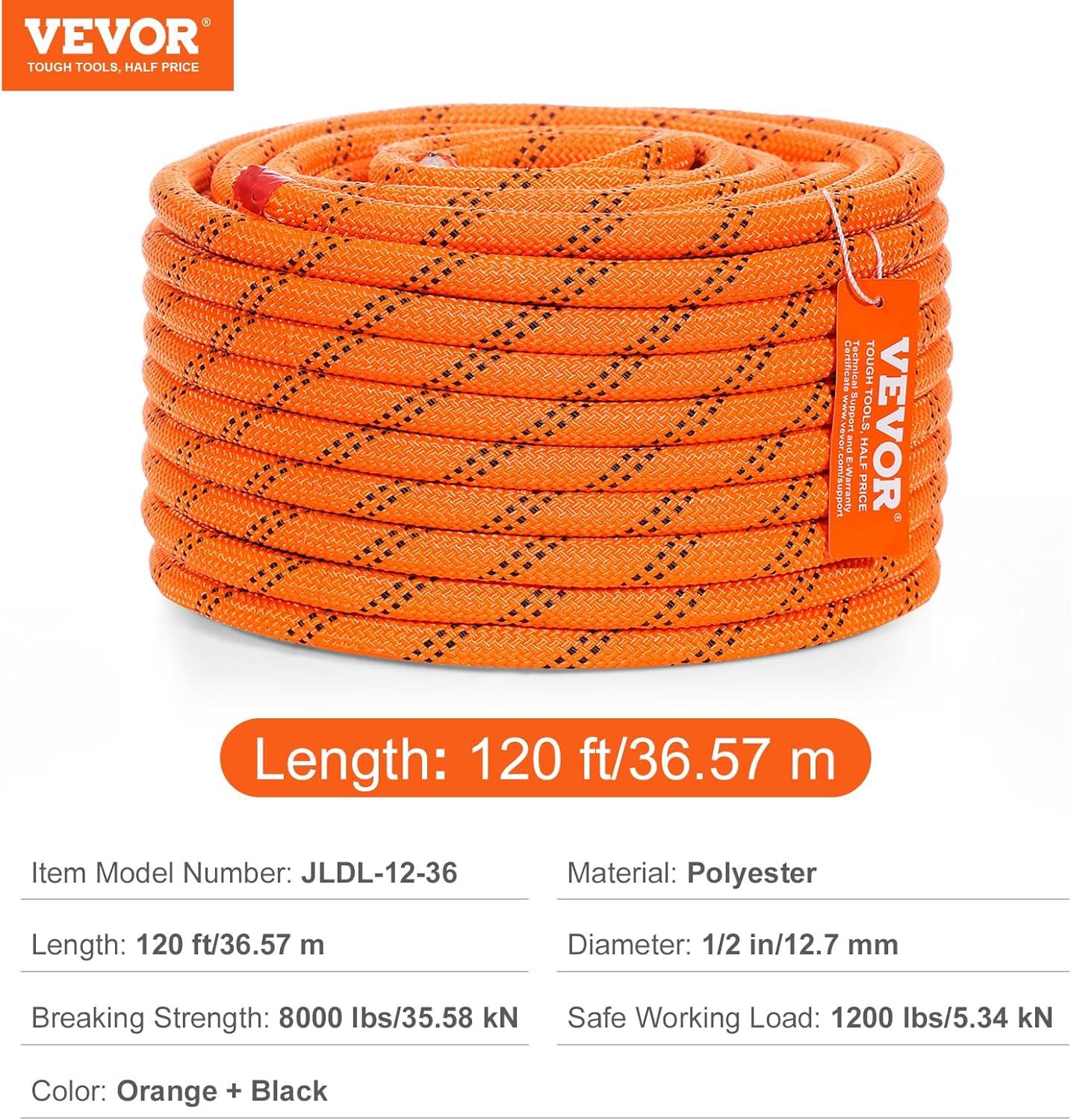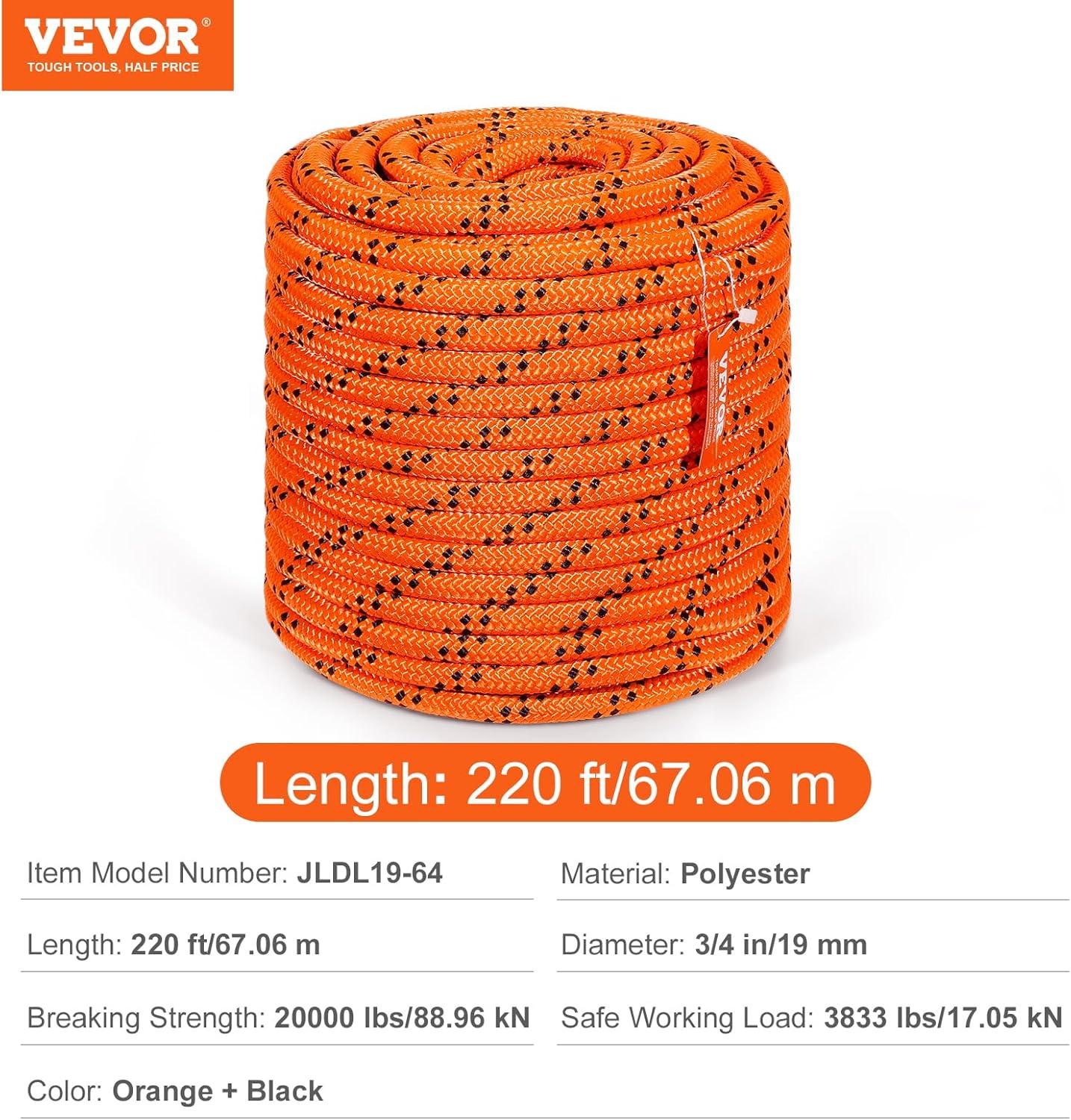 High Strength Rope: VEVOR 1/2 inch diameter double braided polyester rope comes with a breaking strength of 8000 LBS/35.58kN and 220 ft/67.06 m in length. The quality is tough and reliable to handle various professional tasks as per what you need.