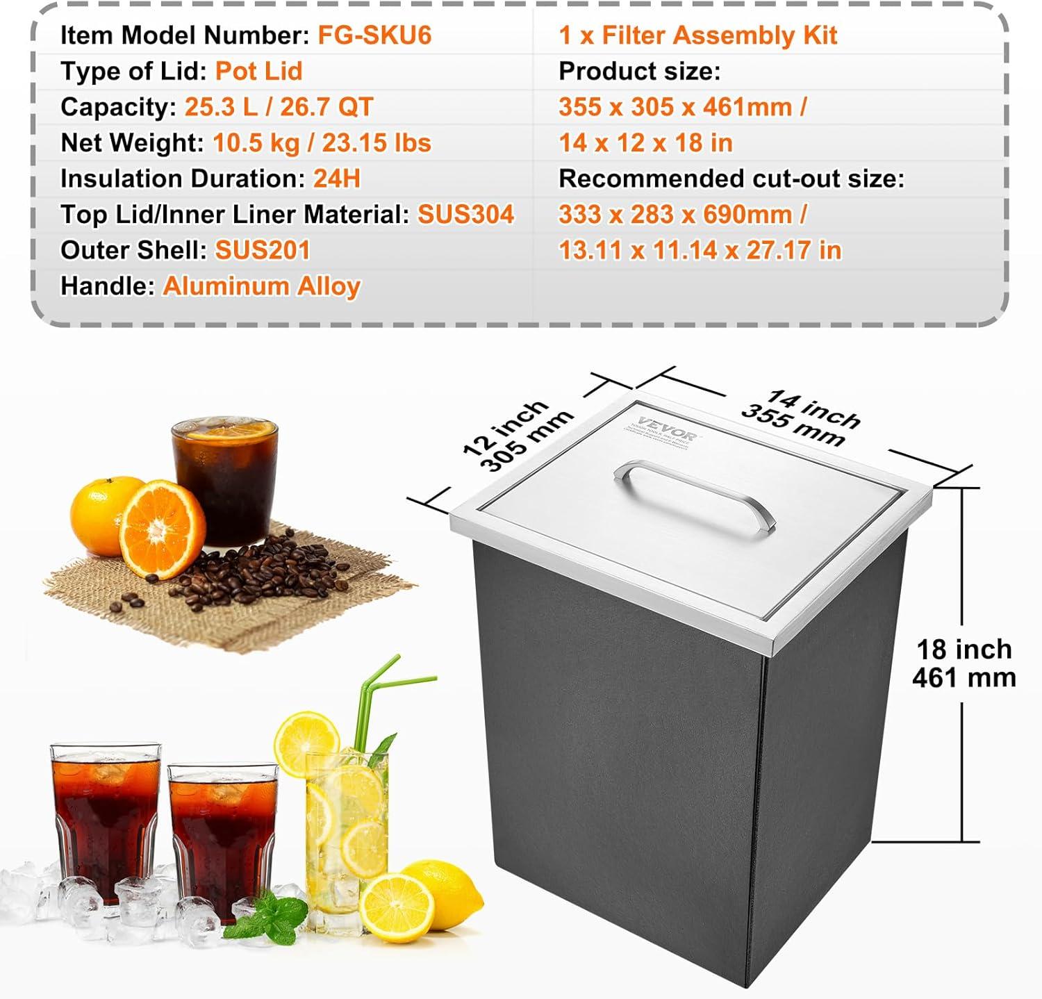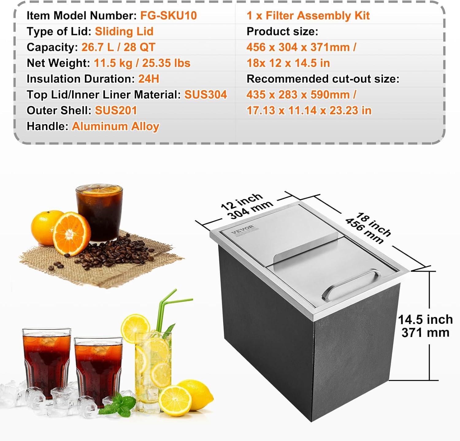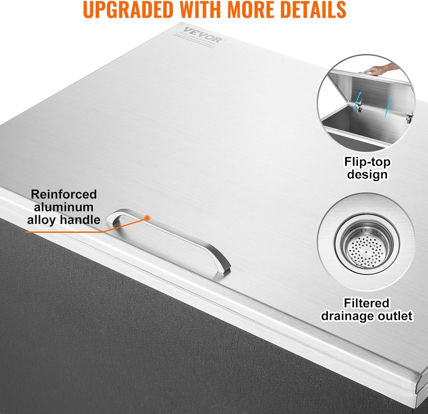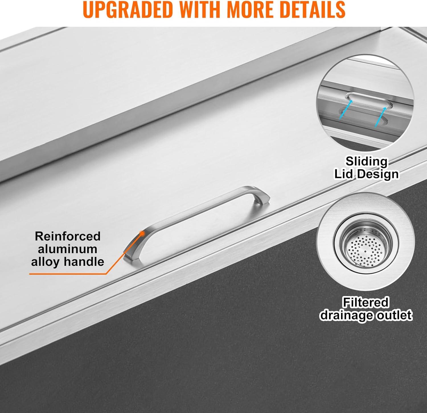 imageVEVOR Drop in Ice Chest 24quotL x 18quotW x 13quotH Stainless Steel Ice Cooler Commercial Ice Bin with Sliding Cover 409 qt Outdoor Kitchen Ice Bar Drainpipe and Drain Plug Included for Cold Wine BeerSilverblack