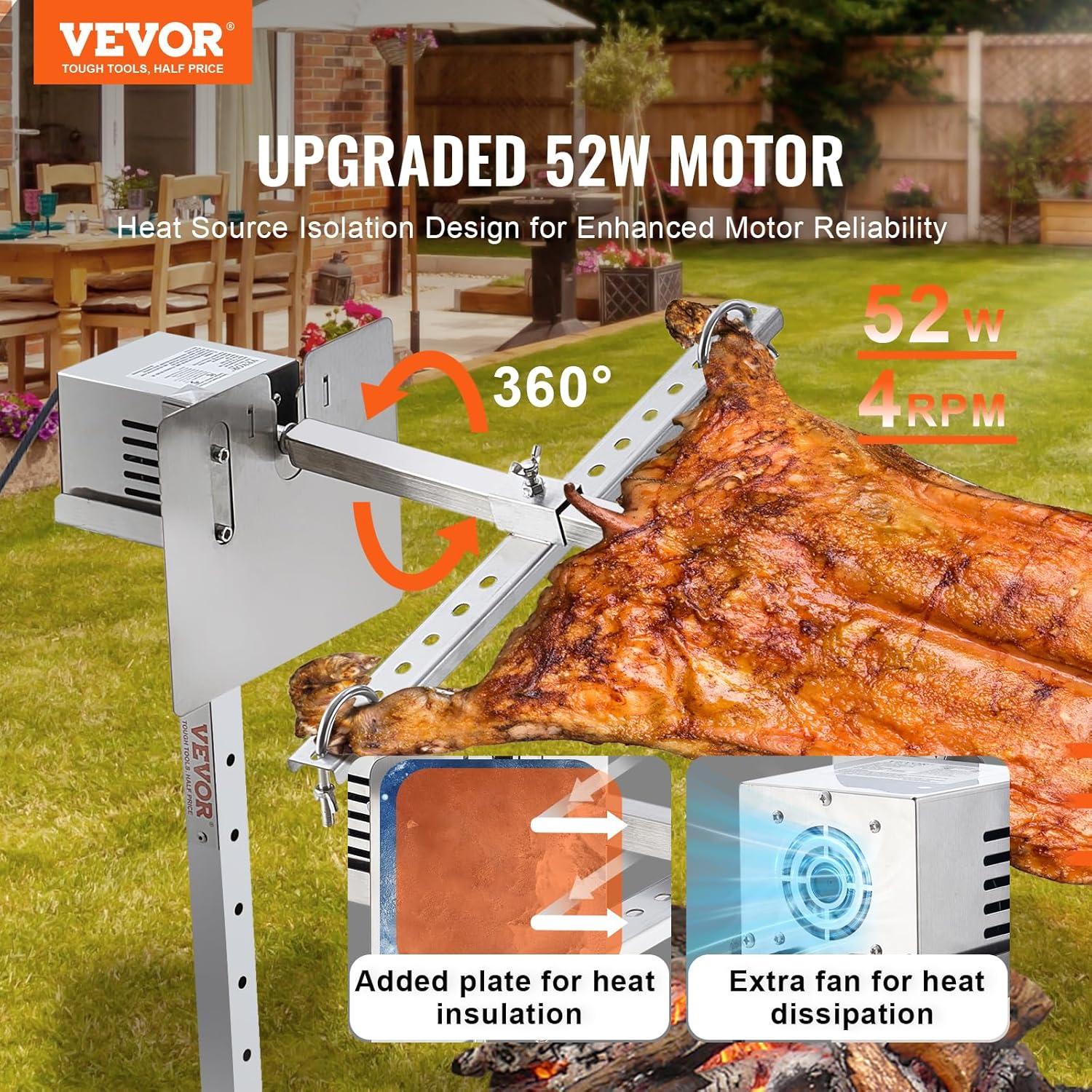 Enhanced Heat Shield: The grill rotisserie kit features a newly upgraded motor, making grilling easier! It includes a powerful 52W motor that can effortlessly rotate the spit rod at 4 RPM. The enlarged heat plate and increased motor fan power effectively block heat sources from impacting the motor, reducing motor malfunctions.