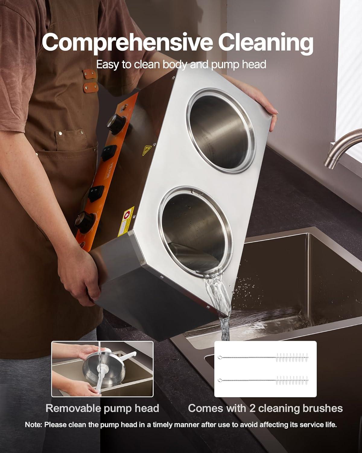 Effortless Cleaning: The cheese sauce dispenser is designed with separate food and water basins, and a detachable pump head for cleaning ease. This design not only facilitates simple water refilling and draining but also ensures comprehensive cleaning without the worry of sauce residues clogging the pump.