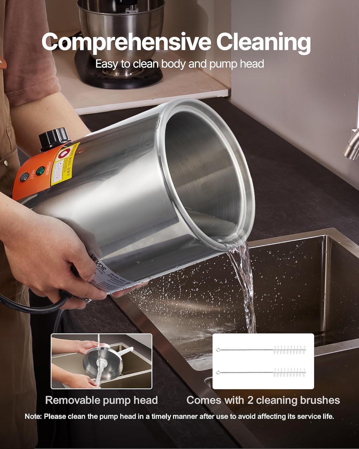 Effortless Cleaning: The cheese sauce dispenser is designed with separate food and water basins, and a detachable pump head for cleaning ease. This design not only facilitates simple water refilling and draining but also ensures comprehensive cleaning without the worry of sauce residues clogging the pump.