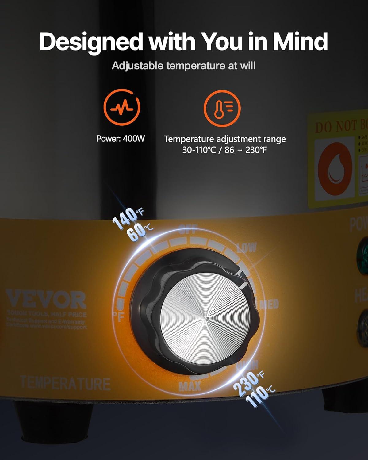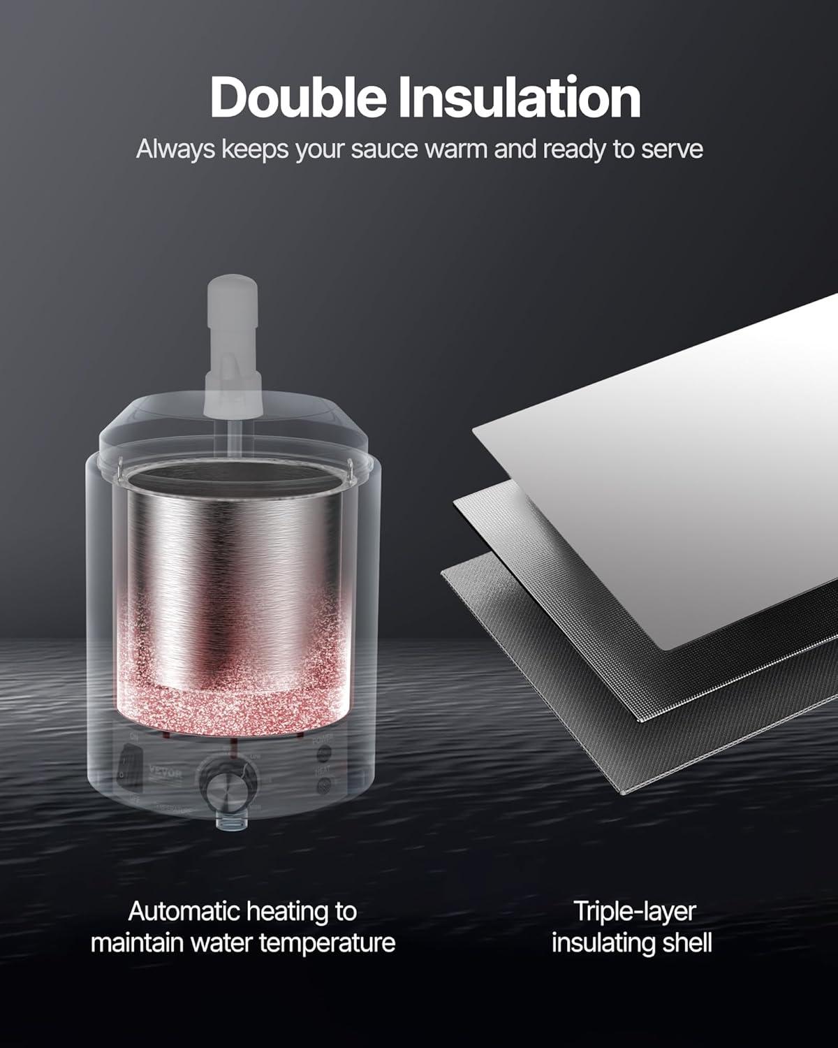 Precision Temperature Control: The hot fudge warmer offers a wide range of temperature settings from 86 ~ 230℉ (30-110℃). Its powerful 600W ensures the water in the tank heats up swiftly to your chosen temperature. Should the water temperature dip, it will automatically reheat to maintain the set temperature, ensuring your sauce remains warm and ready to serve.