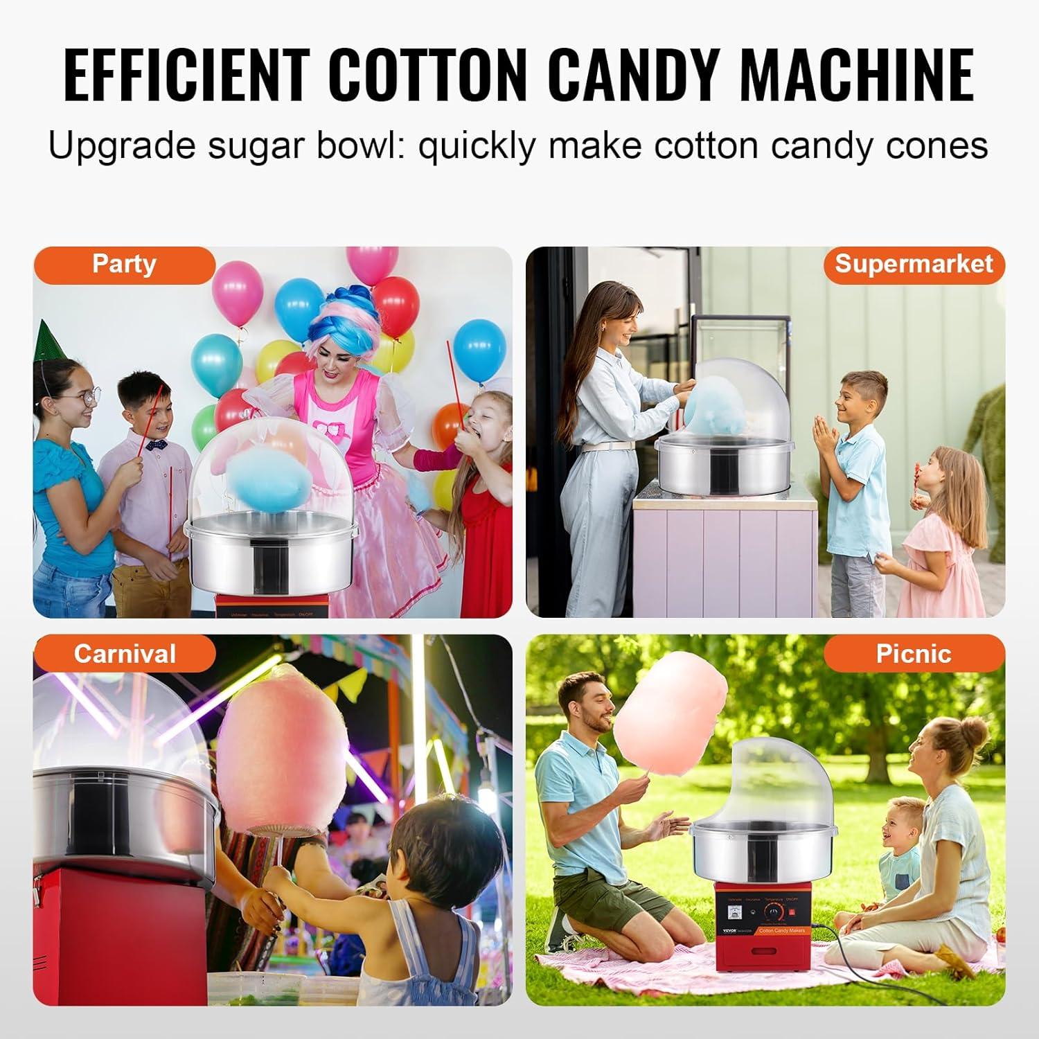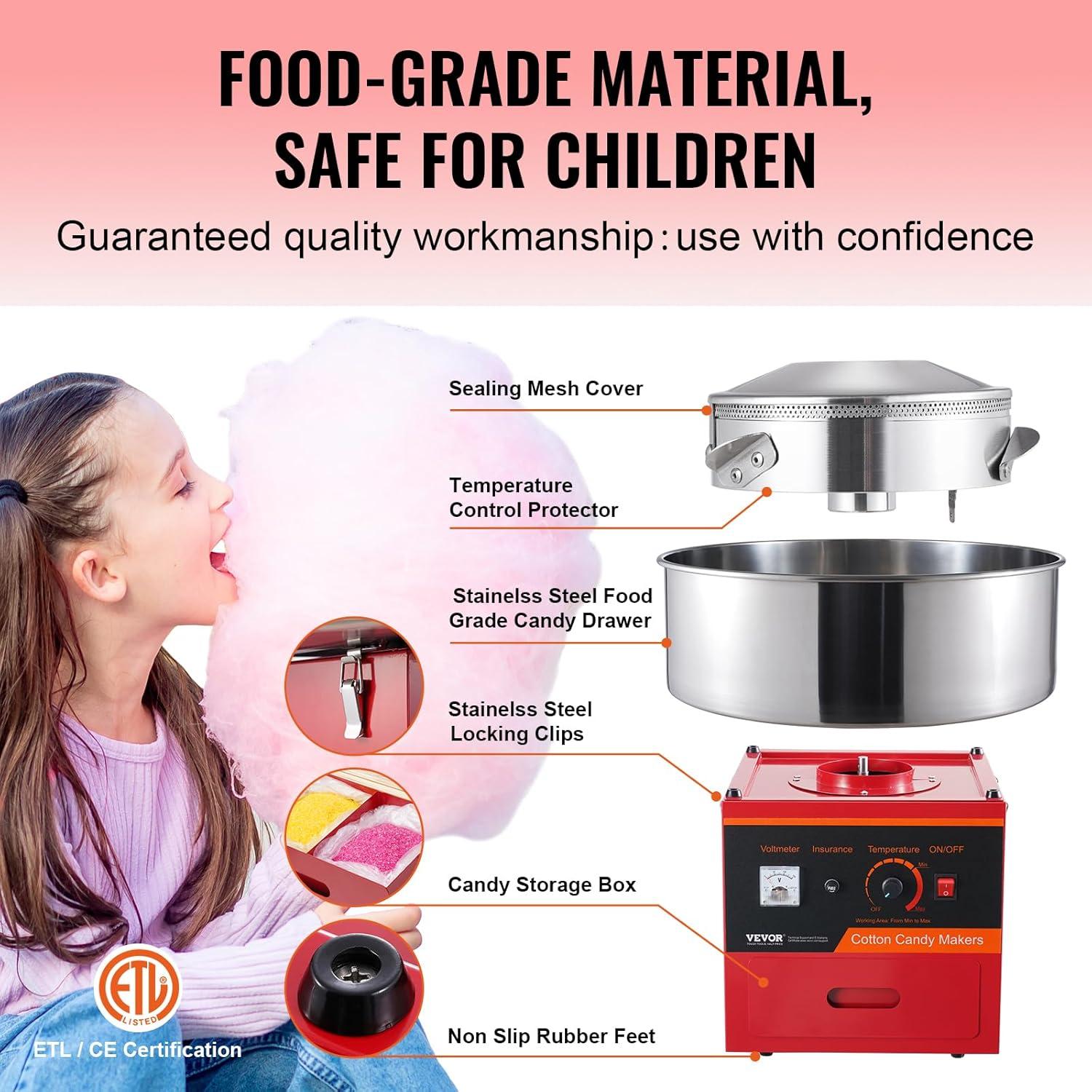 Work with Any Candy You Like: This cotton machine allows you to use the traditional flossing sugars, milk sugars, fruit cubes, or any of your favorite hard candies to make delicious cotton candies. With a compact size, it is suitable for countertop use, and it is perfect for carnivals, festivals, birthday parties, and sports events.