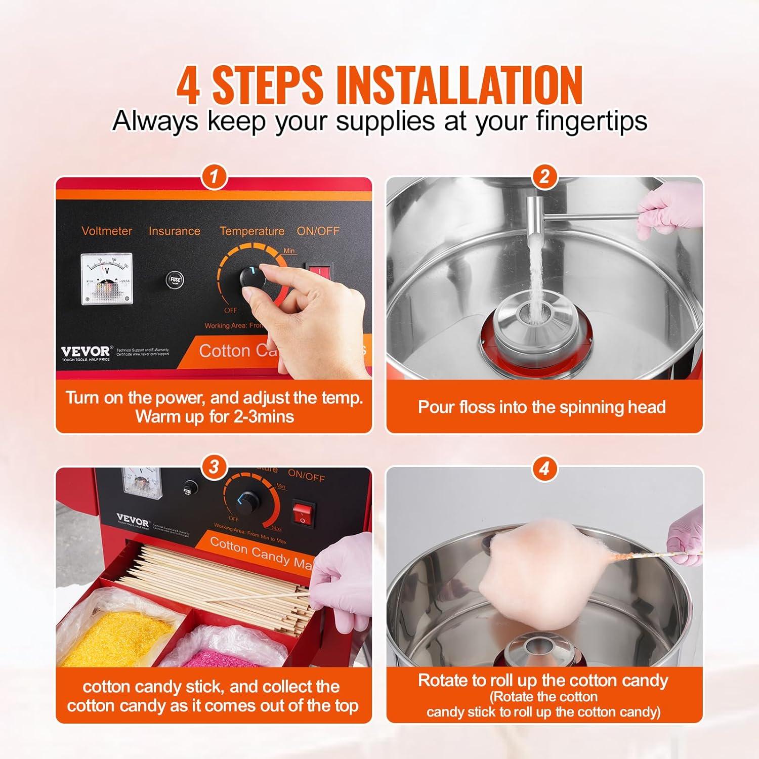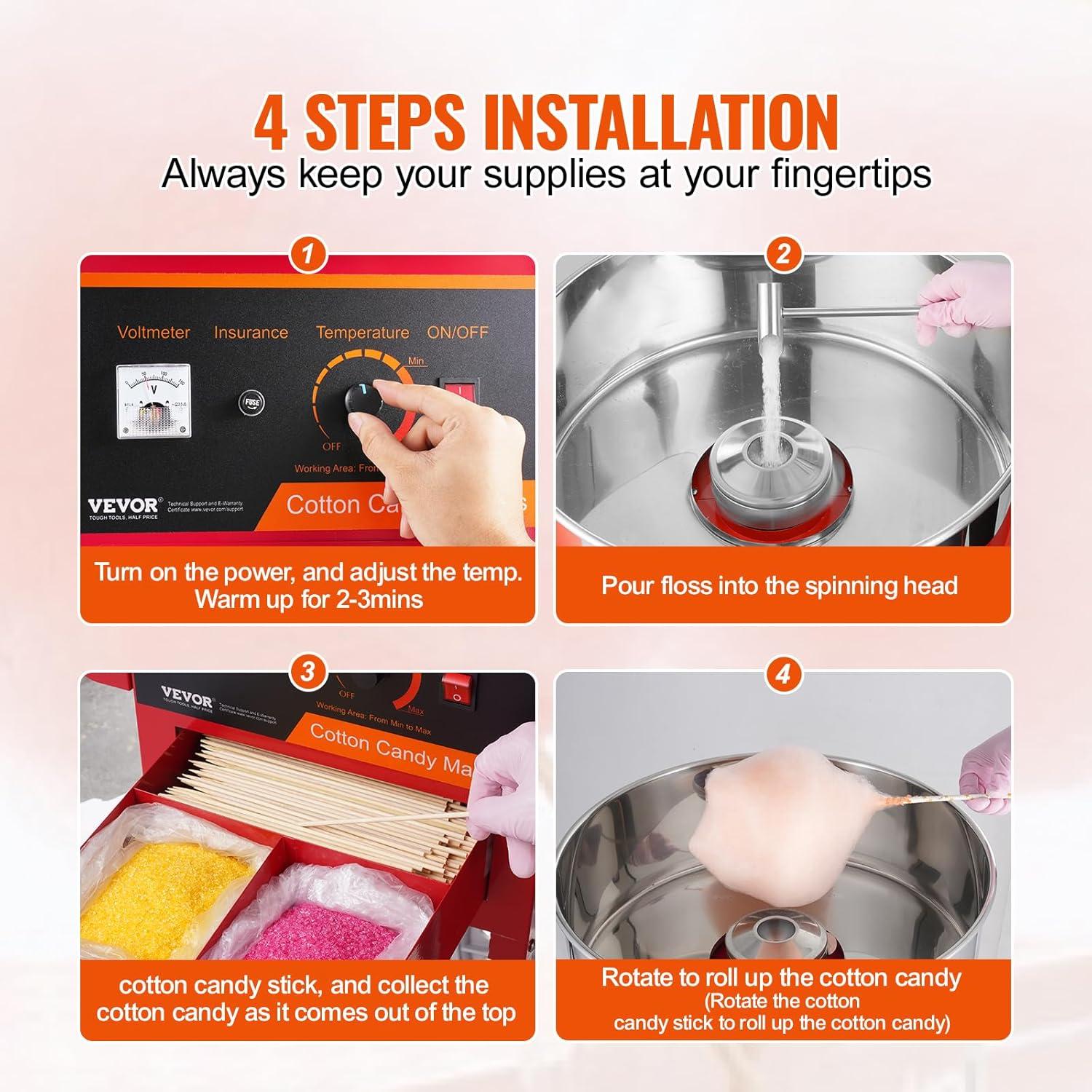 Easy-Operating Process: Using this machine couldn't be easier. Turn on the power, adjust the temperature, warm up for 5-6 minutes, and pour sugar into the spinning head, and then you just need to use the sticks to collect the cotton candies from the head.