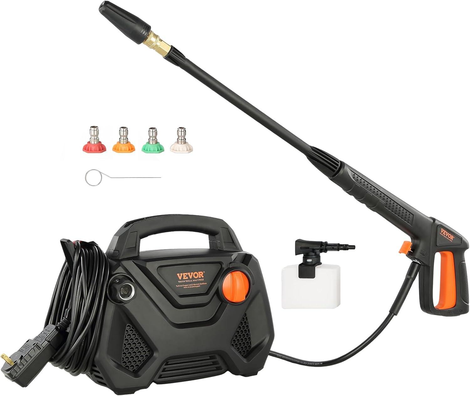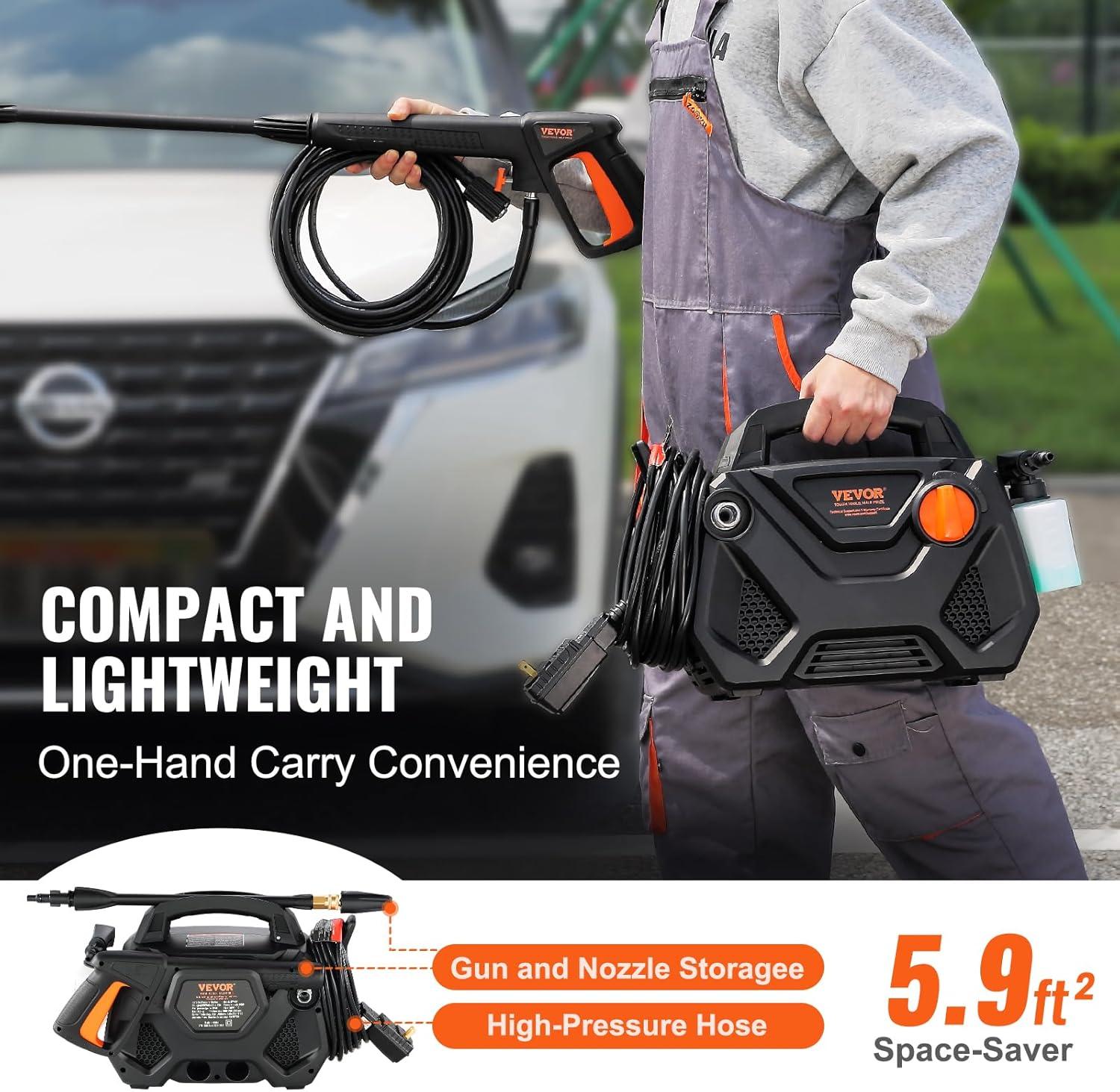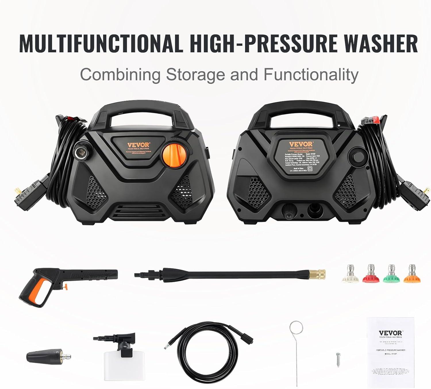Multi-functional Power Washer: The compact and multifunctional design combines storage and usability in one. It's convenient for storing nozzles, the cleaning gun, and the power cord while providing easy connections for water inlet and outlet, allowing you to get started quickly.