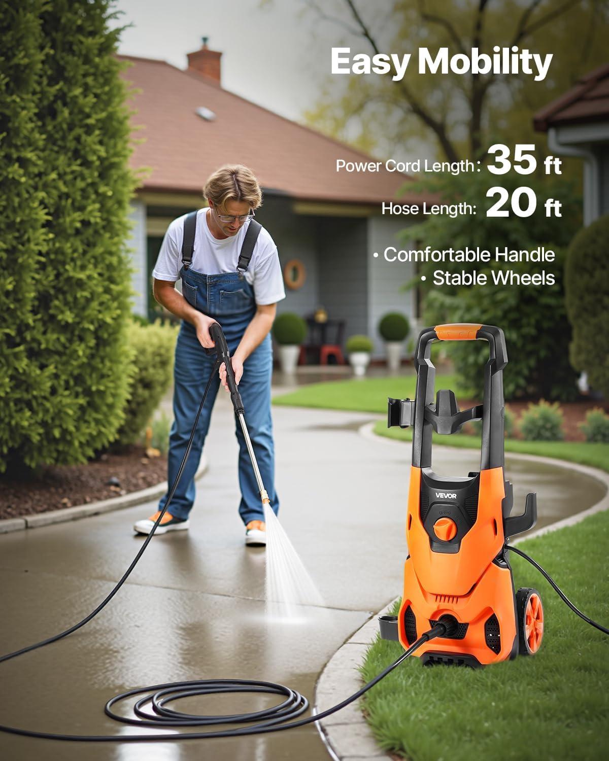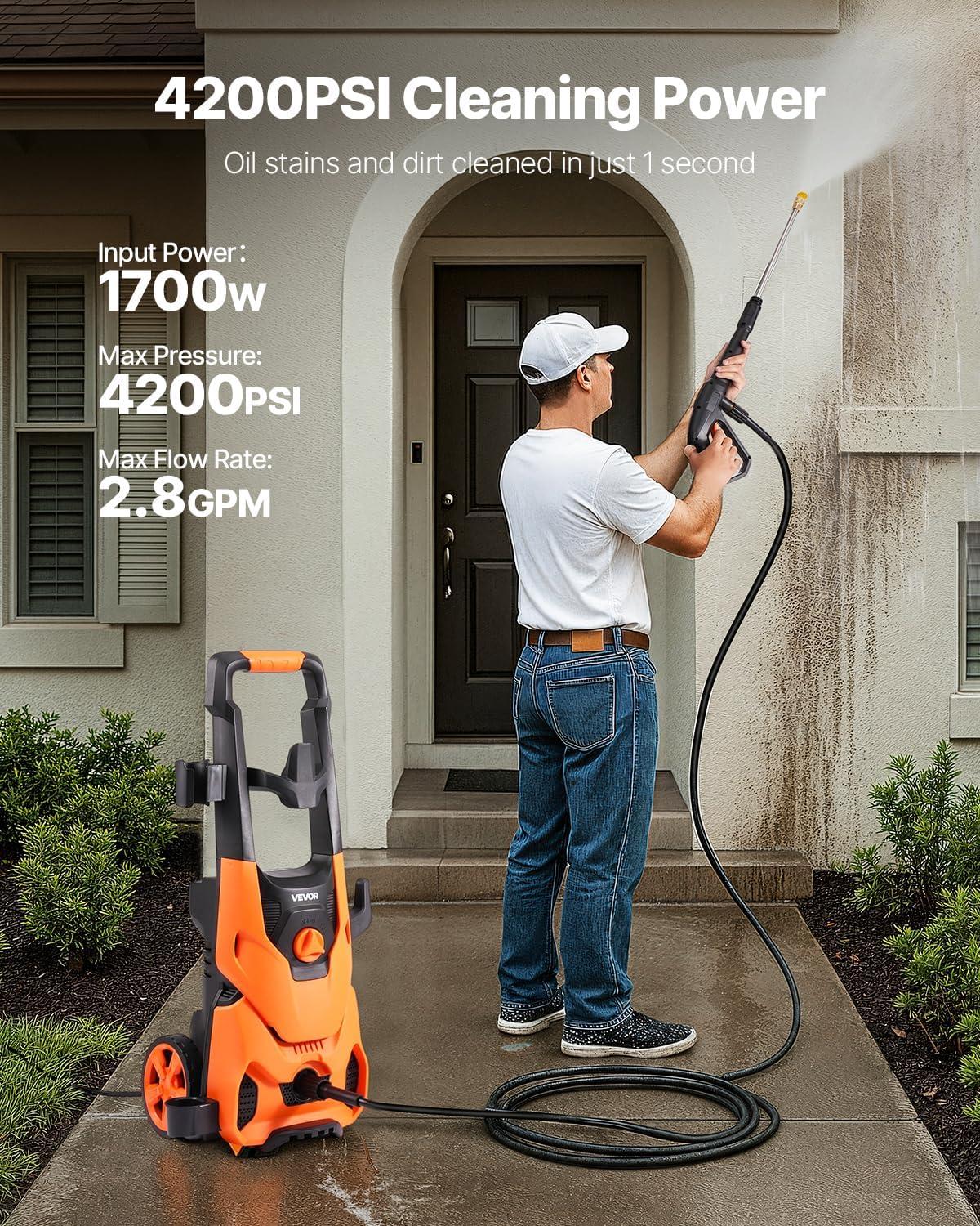 Sturdy & Explosion-Proof Hose: The high-strength PVC hose is wear-resistant and burst-proof, with tightly threaded connections. A pure copper spray gun connector ensures no leakage, making this power washer ready for demanding tasks