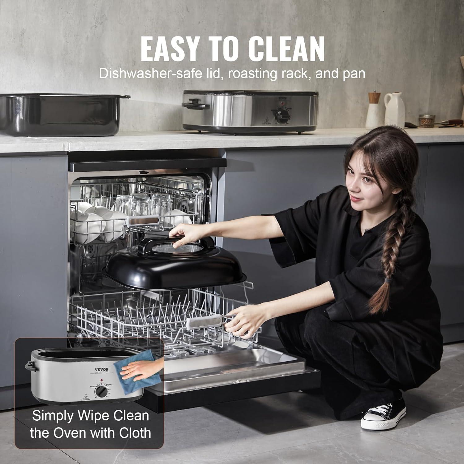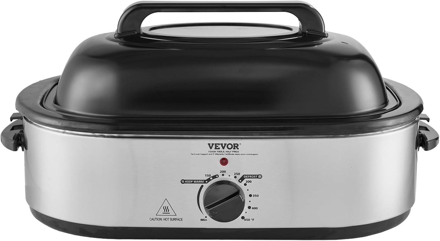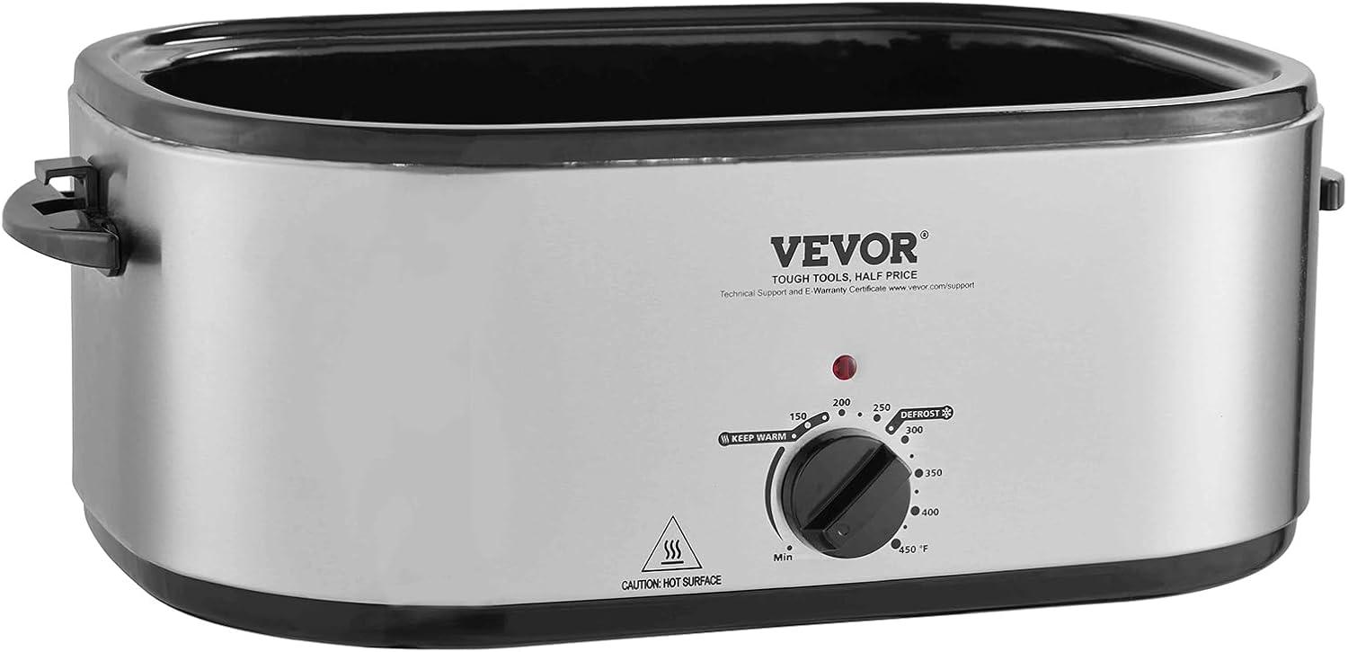 Keep Warm / Defrost / Roast: With 150℉ to 450℉ wide temperature, VEVOR roaster oven offers versatile cooking options for roasting, baking, and slow cooking. The defrost setting allows you to thaw frozen food quickly ; keep warm setting maintains the ideal serving temperature, letting you prepare meals ahead without concerns of them getting cold.