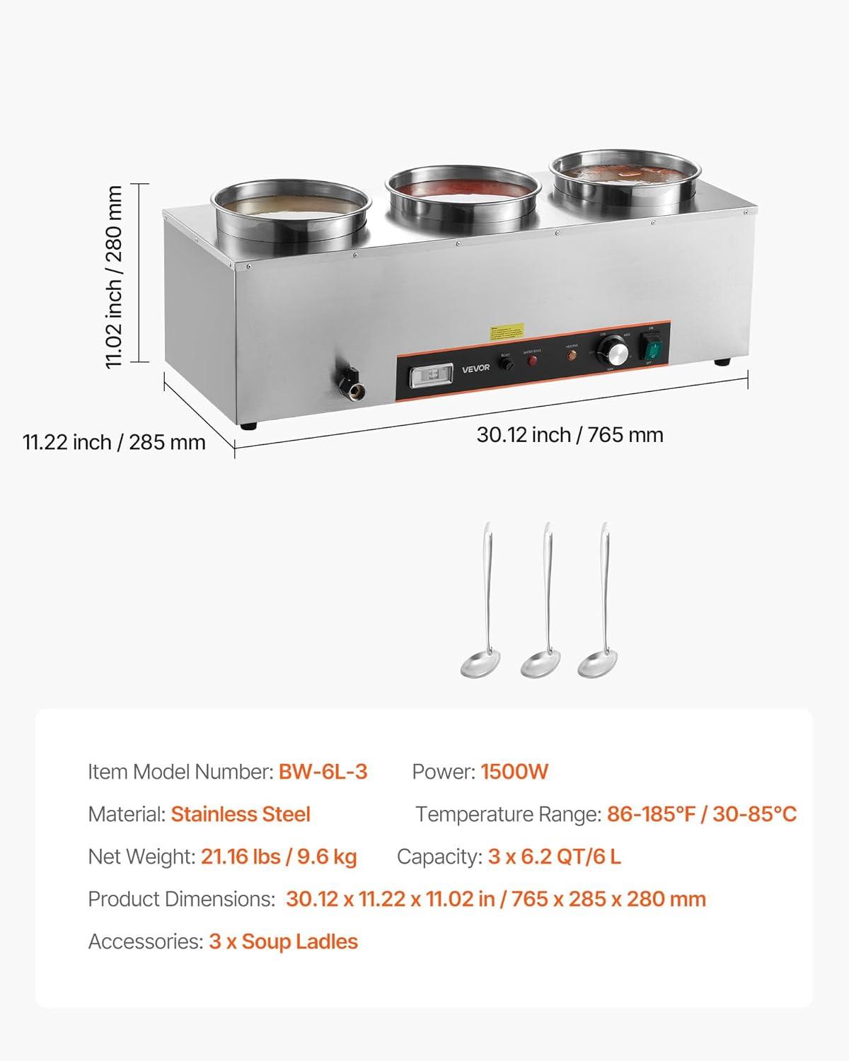 Easy to Use: This soup station boasts a drain faucet for easy drainage and heating/dry burn indicators to show the warmer’s status. The main power switch lets you turn off the unit with one press, eliminating the need to plug/unplug frequently