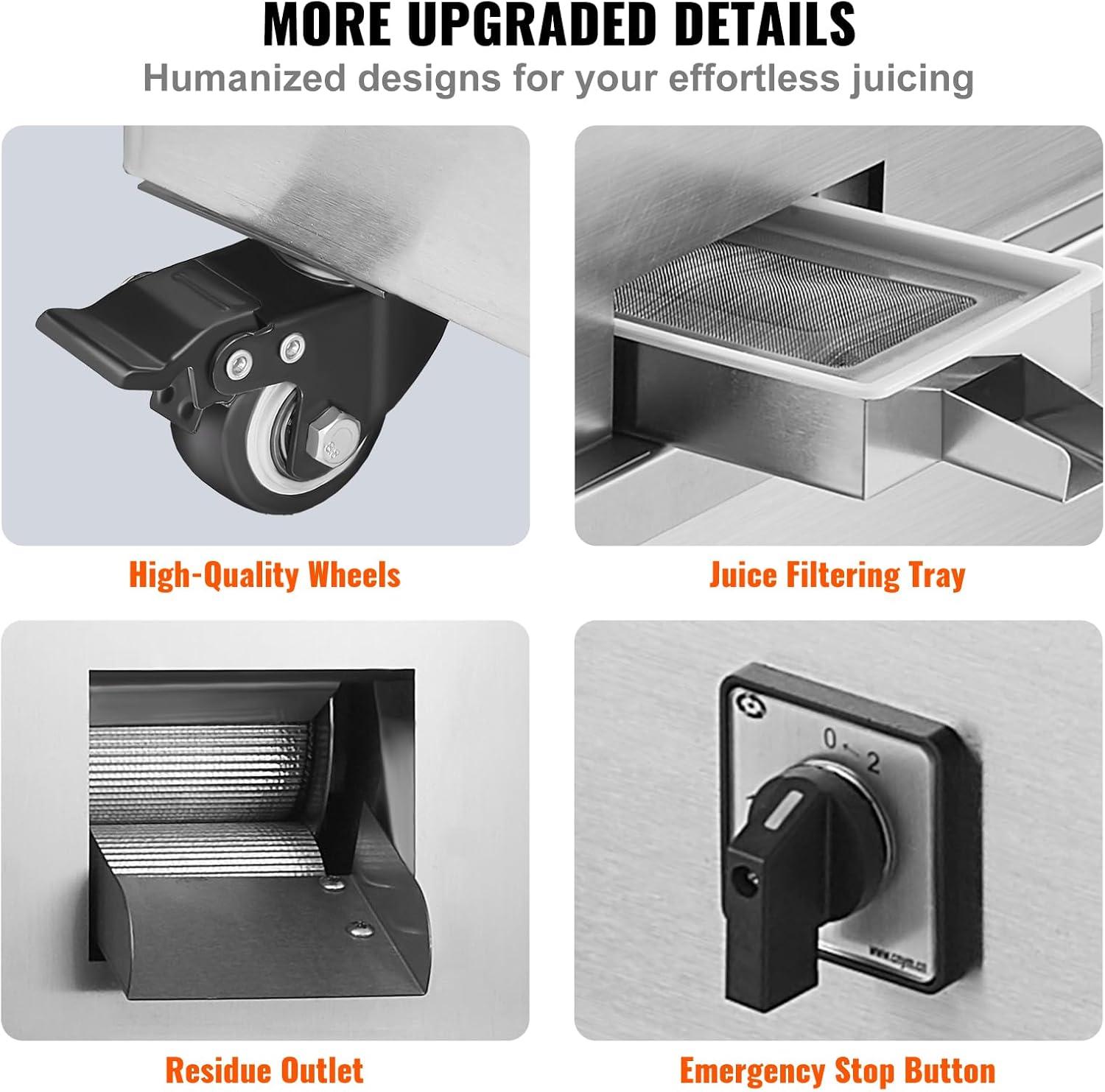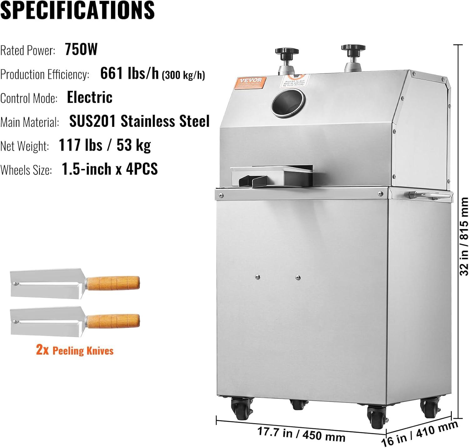 Efficient Juicing Productivity: VEVOR electric sugar cane juicer is equipped with 800W powerful motor, along with 4 solid stainless steel rollers, making sugarcane juicing more effortless and efficient. 661LBS/H high productivity maximizes juice output and efficiency.