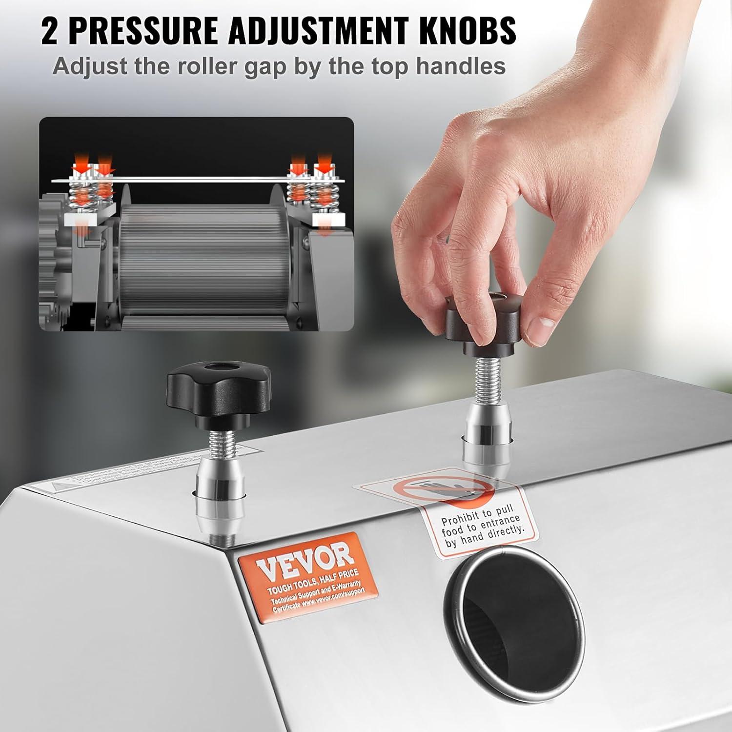 Automatic Roller Pressure Adjustment: No need for manual adjustment! Our sugarcane juicer press extractor can automatically adjust the roll gap according to different sizes of cane. Plus, the 2.4-inch large feeding inlet can accommodate large-sized sugarcane with ease.