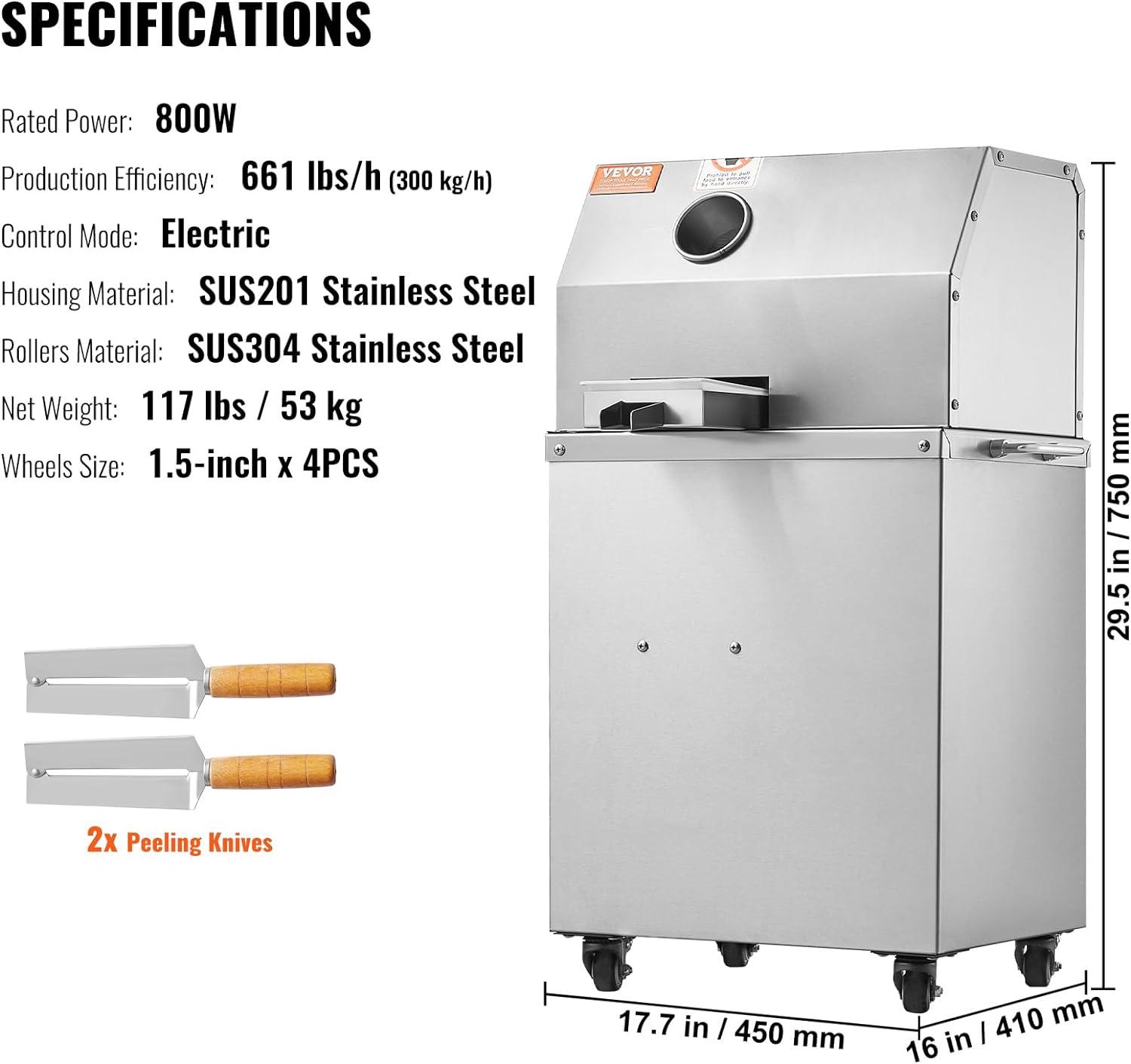 Efficient Juicing Productivity: VEVOR electric sugar cane juicer is equipped with 800W powerful motor, along with 4 solid stainless steel rollers, making sugarcane juicing more effortless and efficient. 661LBS/H high productivity maximizes juice output and efficiency.