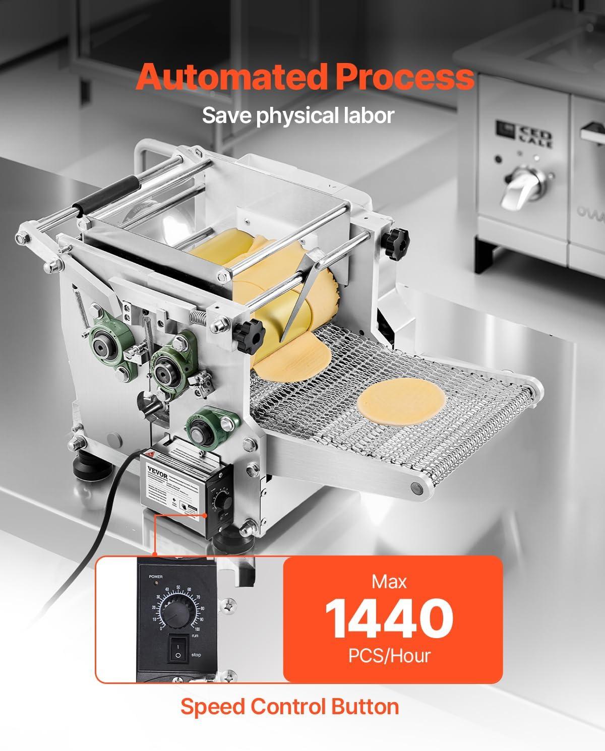 Automatic Design: This electric tortilla maker is easy to use—just place the dough into the top roller entrance, and it presses tortillas at a speed of up to 1,400 per hour, saving significant time and effort.
