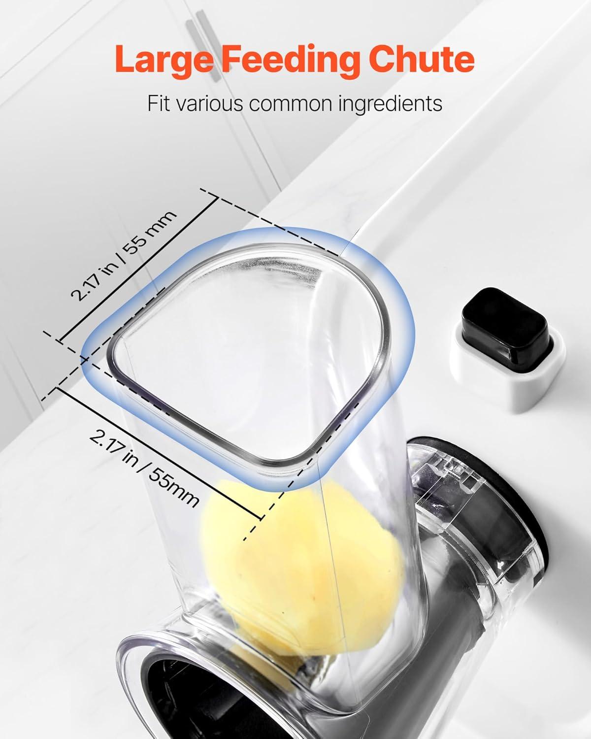 Smooth and Efficient: The food chute measures 8.7″ x 5.1″ x 6.3″, accommodating common ingredients such as potatoes, lemons, cabbages, carrots, and cheese. It allows for easy slicing of various foods, regardless of their softness, size, or hardness. In electric mode, the spring lever automatically pushes the food forward for slicing. The vegetable cutter also includes a soft spring, preventing tomatoes, kiwis, and cheese from being flattened. Six suction cups prevent any movement during use.