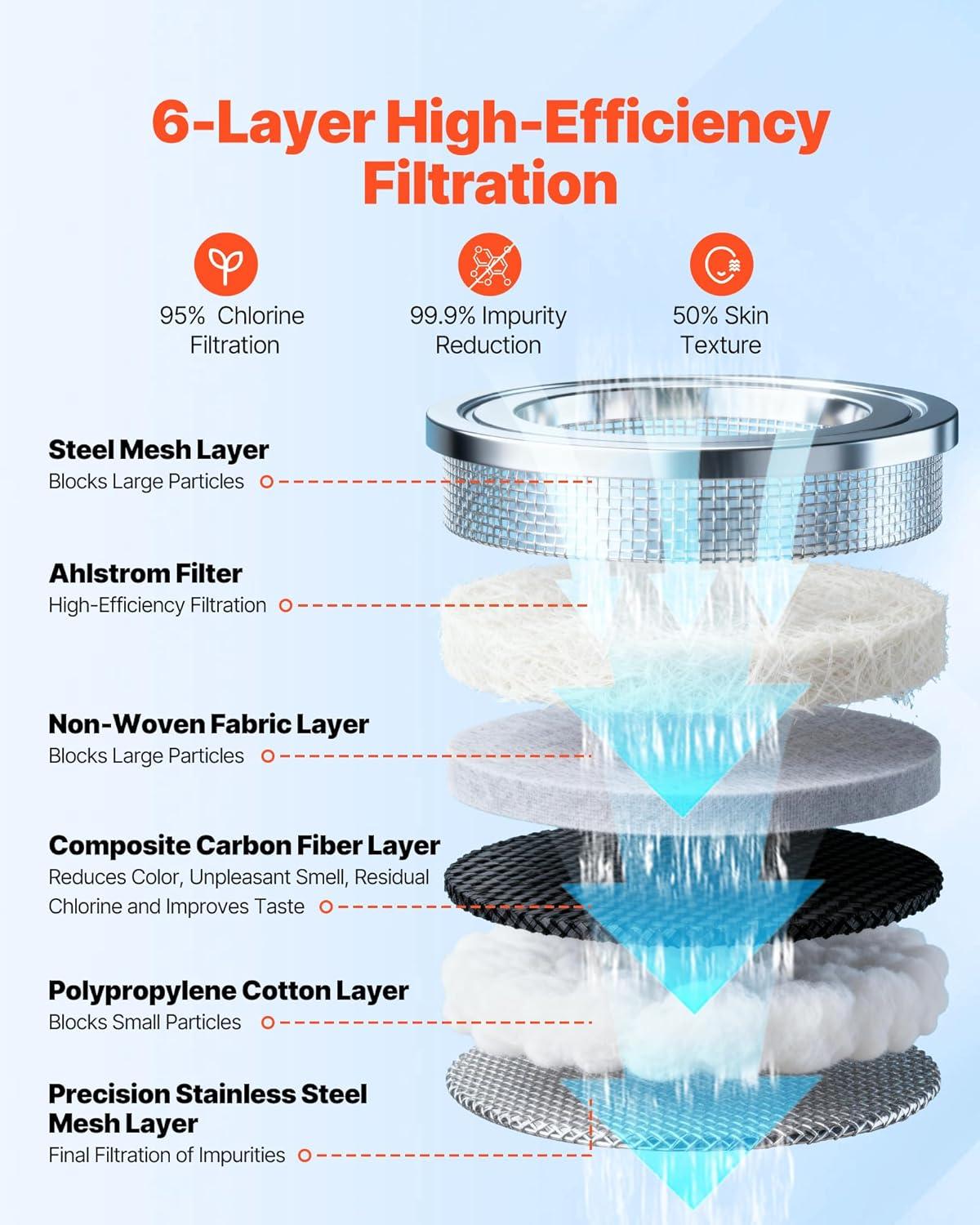 High-Efficiency Filtration: Using premium carbon fiber composite media, this faucet filter replacement strongly adsorbs contaminants, effectively removing chlorine, rust, fluoride, and other harmful substances, improving water purity and taste for family use