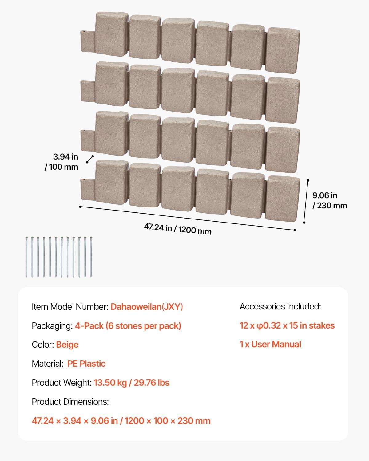 VEVOR Faux Stone Landscape Edging, No Dig Garden Edging Border, Flexible Blocks for Lawn Edging, Flower Beds, Driveway, Yards with 12 Spikes, 4 Pack 24 Bricks 16FT Kit, 47.2" Lx 4" W x 9" H, Beige(Beige)