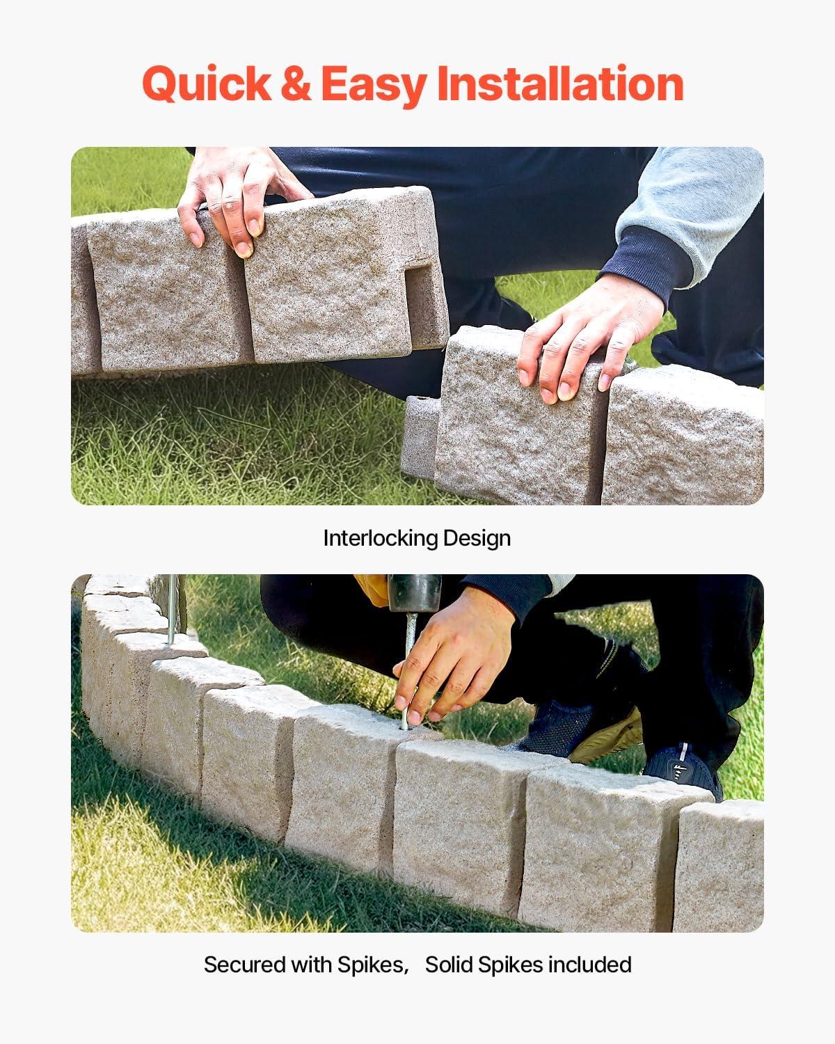 VEVOR Faux Stone Landscape Edging, No Dig Garden Edging Border, Flexible Blocks for Lawn Edging, Flower Beds, Driveway, Yards with 12 Spikes, 4 Pack 24 Bricks 16FT Kit, 47.2″ Lx 4″ W x 9″ H, Beige(Beige)