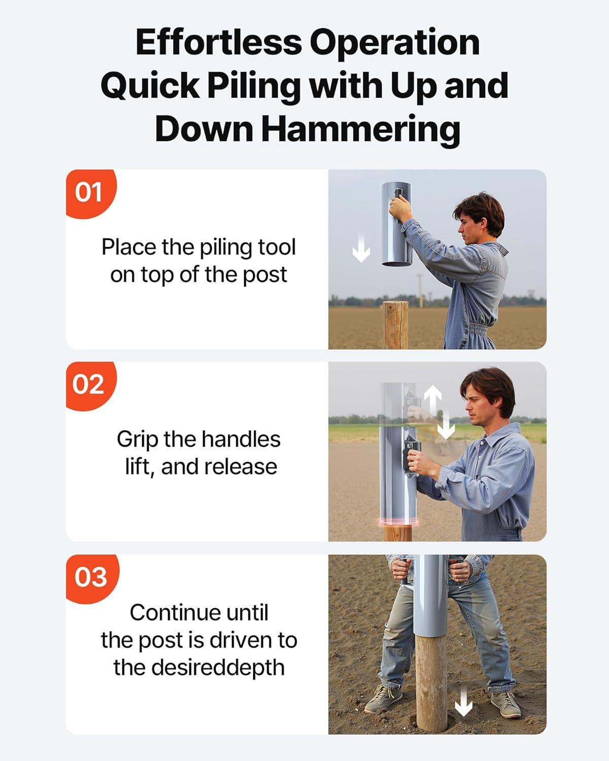 Wide Application: Ideal for orchard trellis installation, farm and ranch fencing, road renovations, and riverbank construction. For installing fence posts,wooden stakes,steel poles. NOTE: Avoid sandy, rocky, or root-filled ground for effective piling