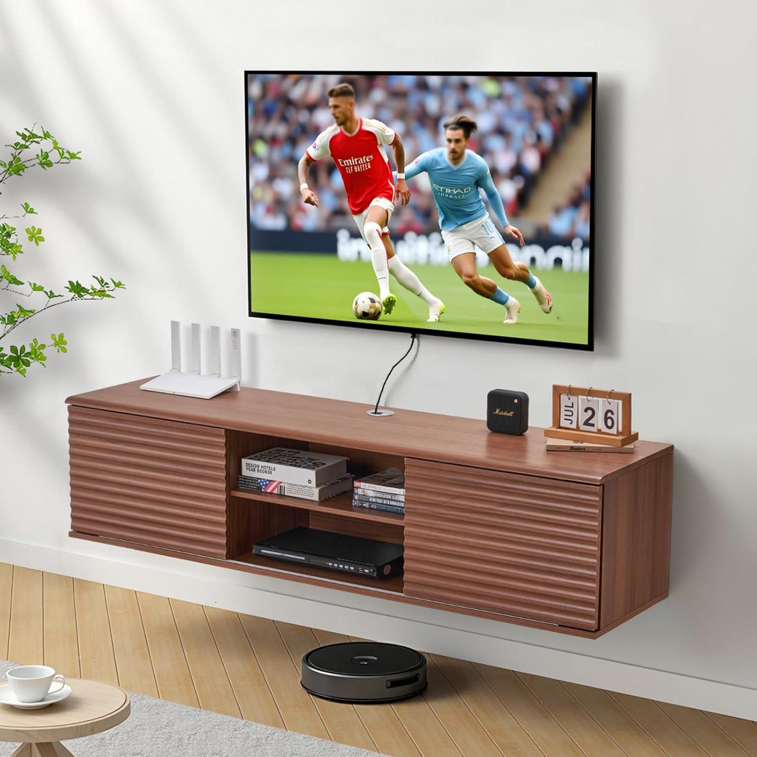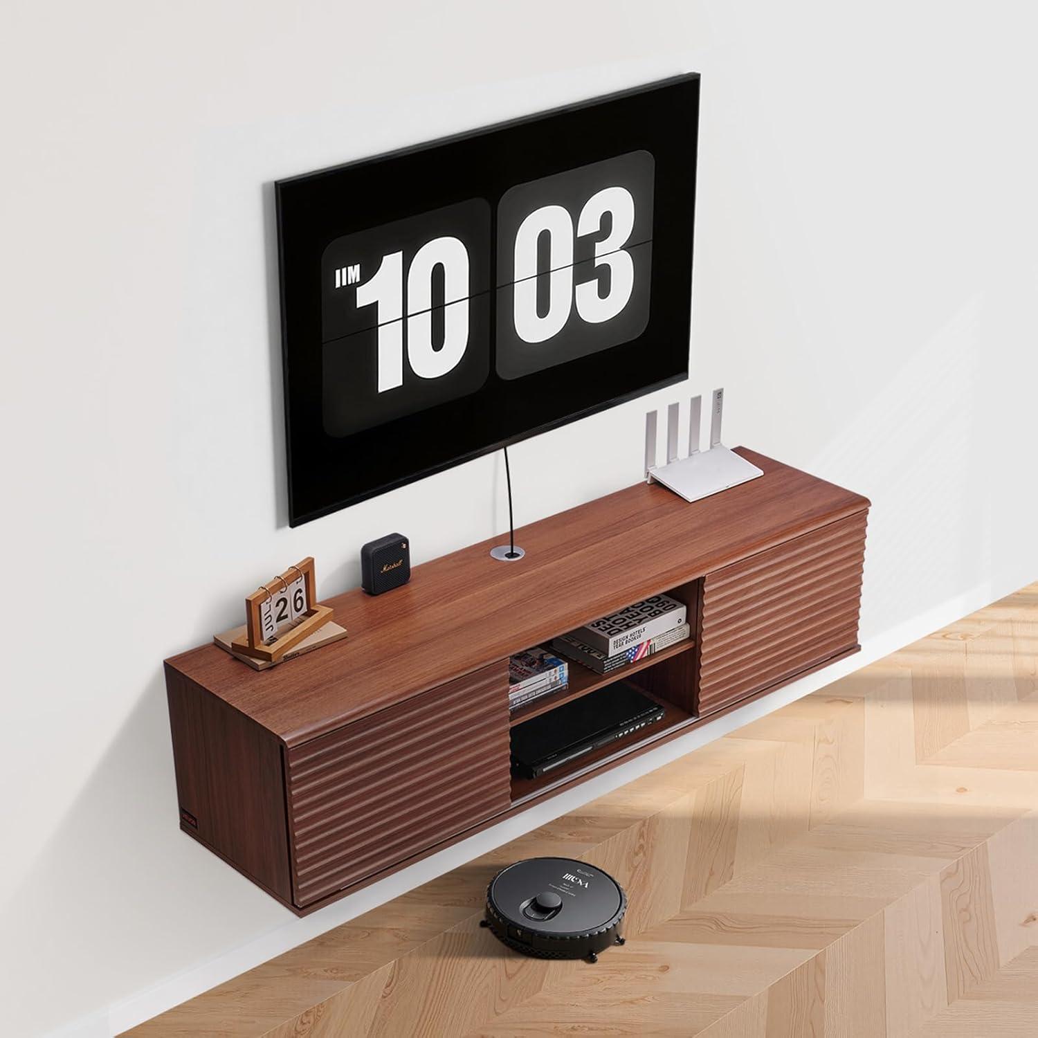 Sturdy and Durable: Crafted from E1-grade particleboard with an MDF surface layer and melamine finish, this floating TV stand is built to last. It can hold up to 115 lbs, so it’s ideal for your TV and other devices. Durable enough to last, it’ll keep your setup looking great for years.