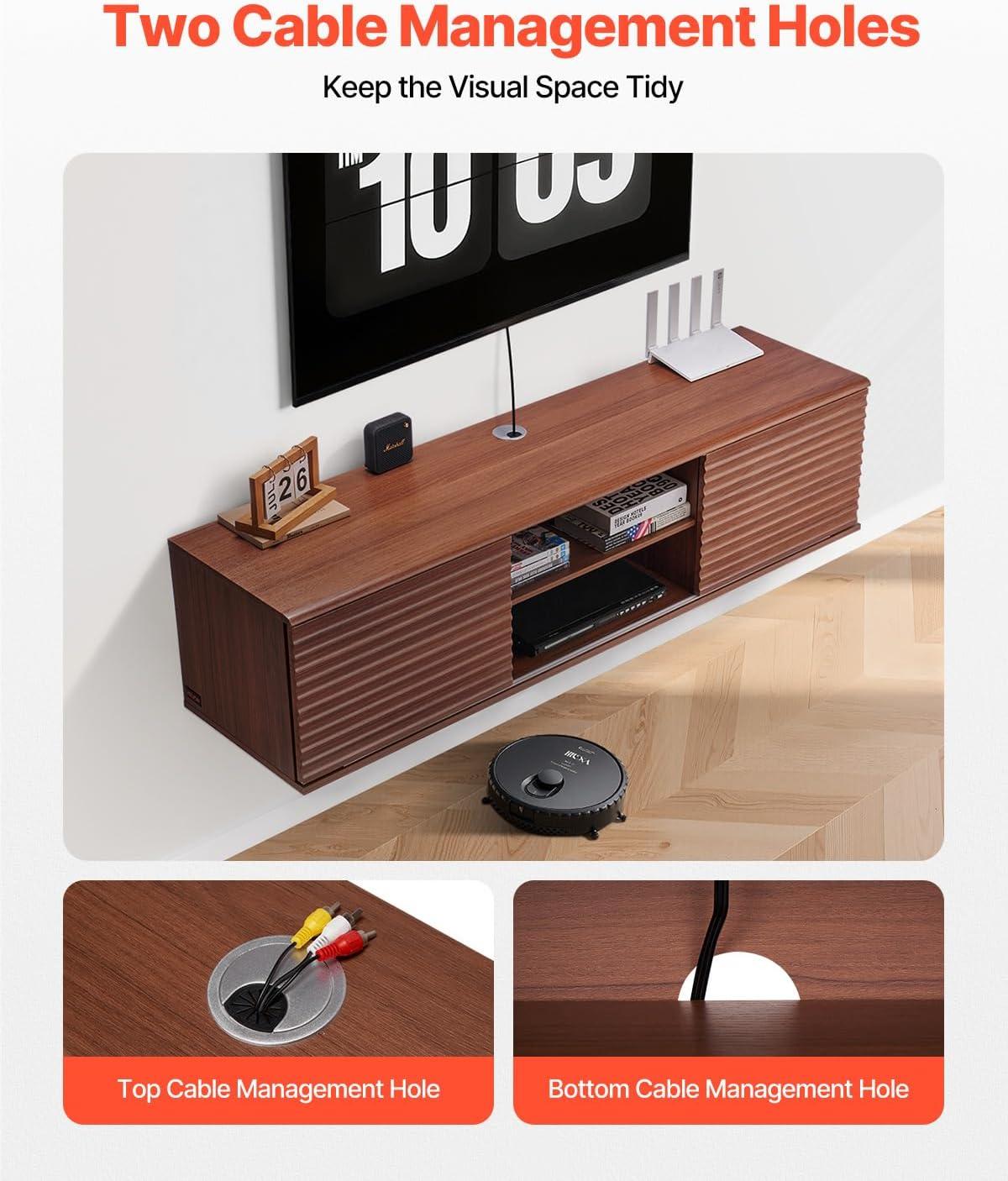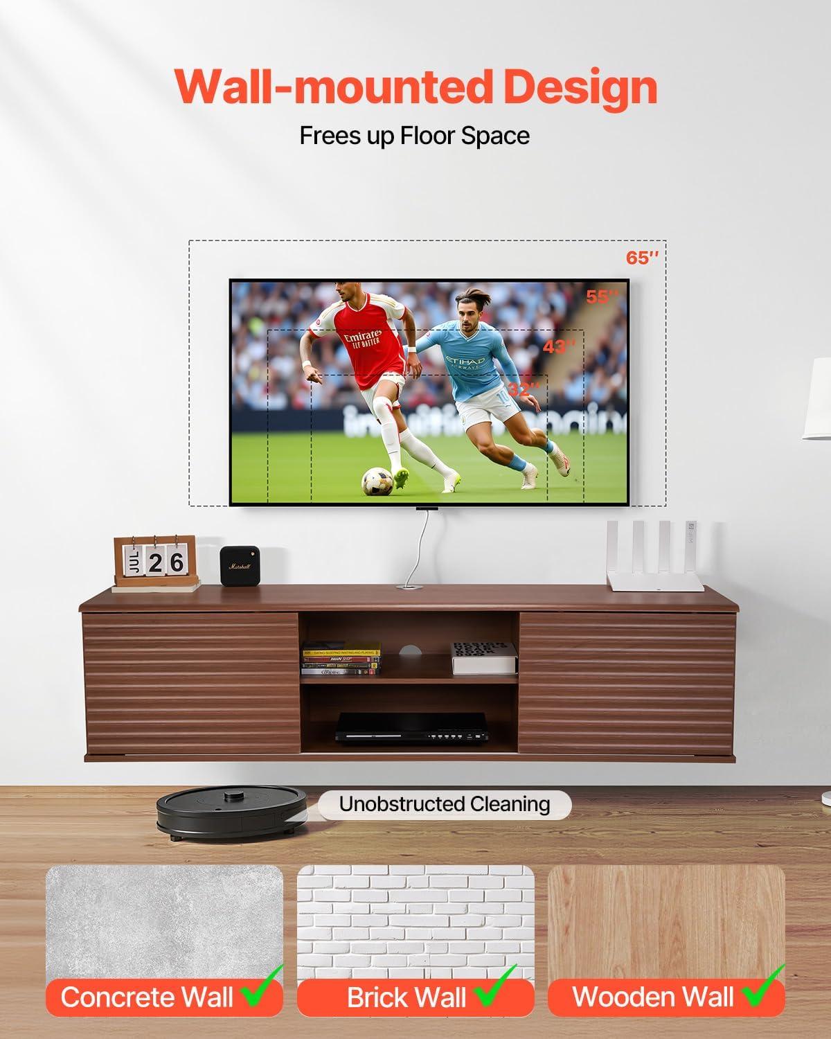 Ample Storage Space: Keep your living room neat and organized! The wall-mounted design frees up floor space and makes it easy for your robot vacuum to clean. It fits various TV sizes and has a storage cabinet for books and other essentials, plus hidden cable holes to keep things tidy. No more clutter, just a streamlined look!