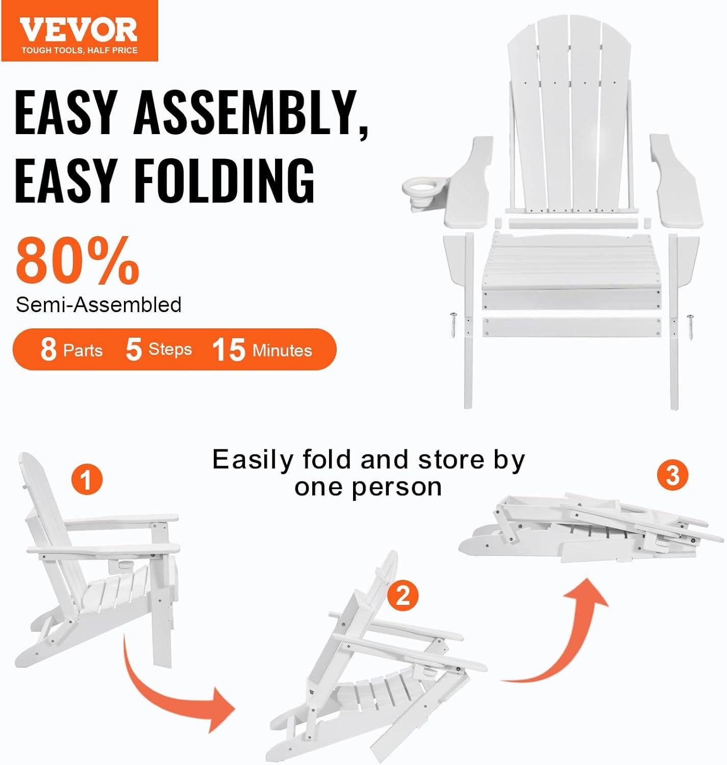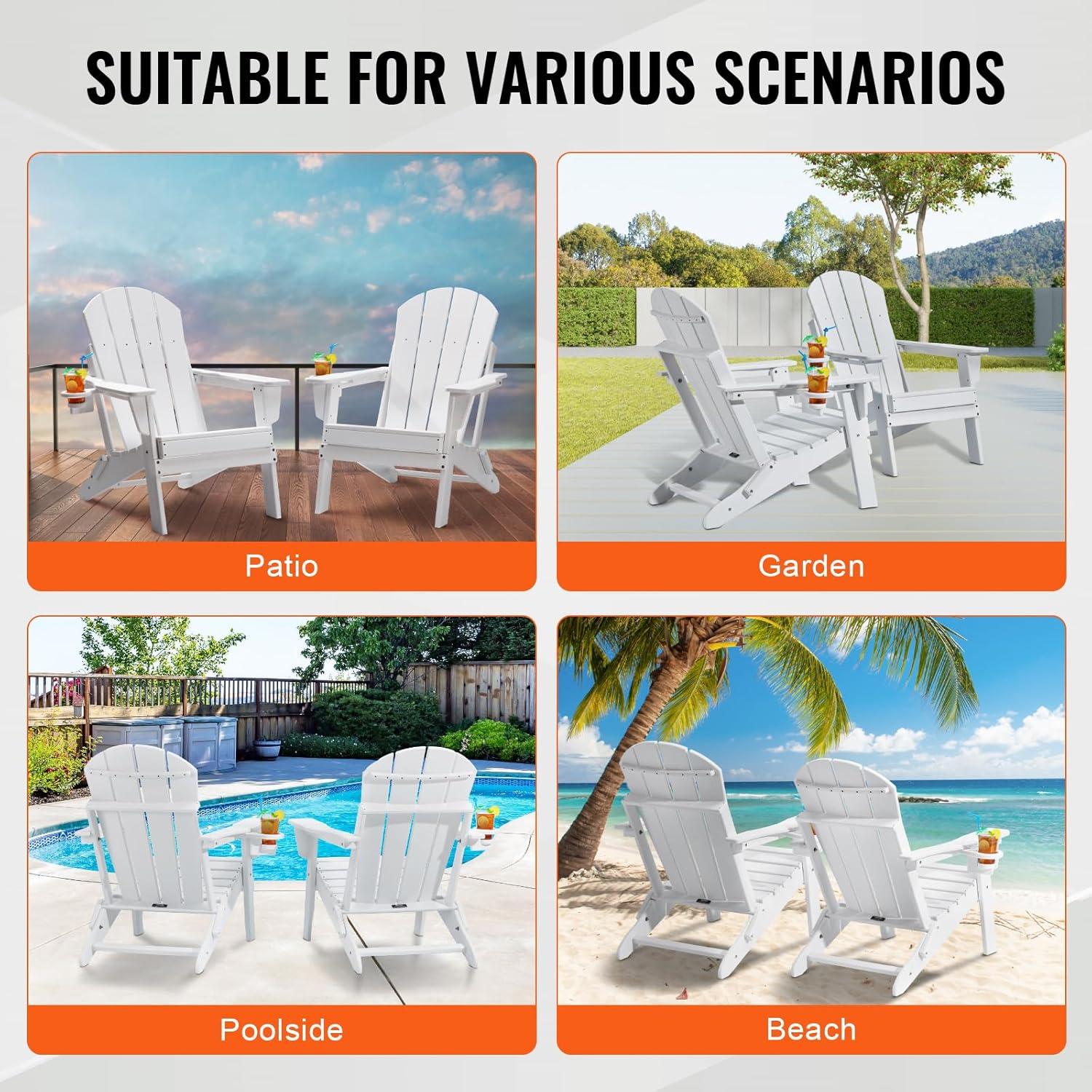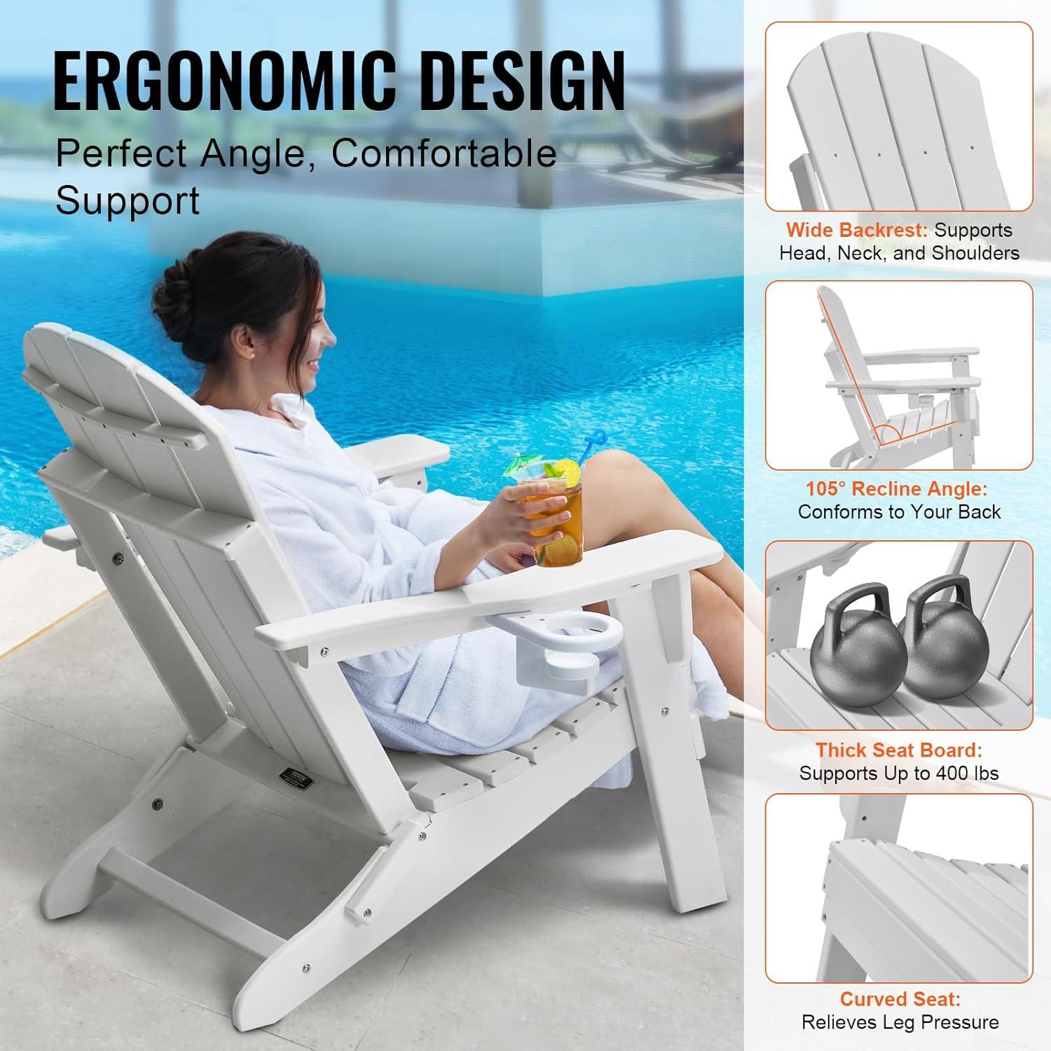 VEVOR Folding Adirondack Chairs Set of 2 with Cup Holder, All-Weather Portable Plastic Fire Pit Chair, Outdoor Adirondack Patio Chair, with Relaxing Arm Rest Ergonomic, for Garden, Backyard, Black(White Plastic Adirondack Chairs Set of 2 With Cup Holder)