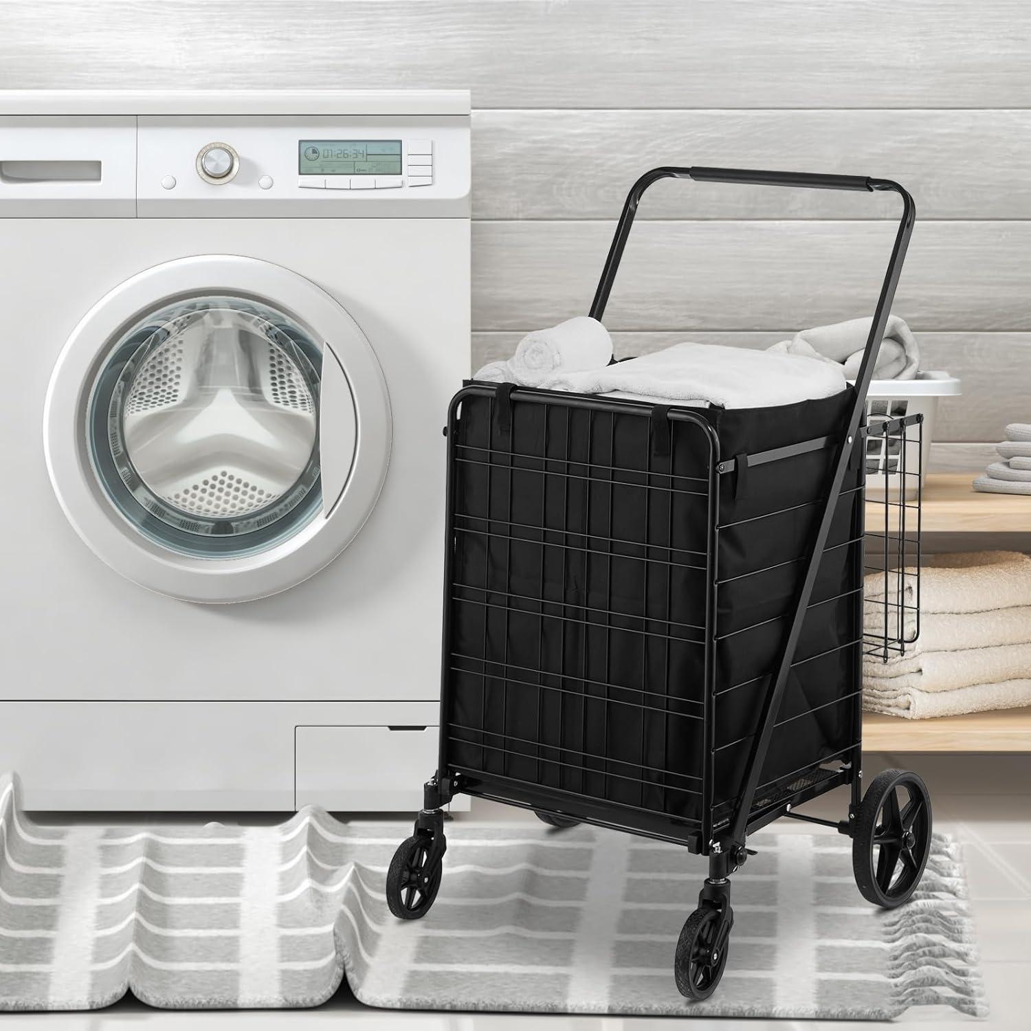 Compact & Collapsible Design: The portable design makes the folding shopping cart easy to fold up in seconds for convenient transportation and storage. Just store it in the trunk, garage, cabinet, closet, or under the bed without occupying excessive space.