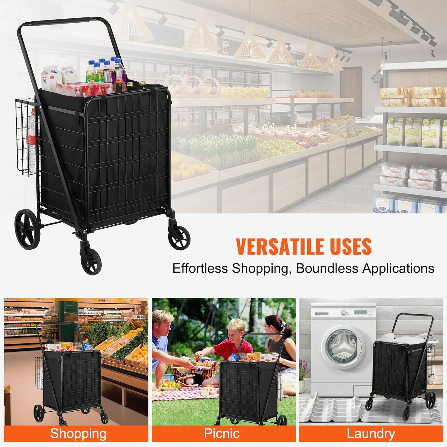 Versatile & Hassle-Free Assembly: Our grocery cart is designed to effortlessly transport a wide range of items, including laundry, groceries, camping gear, and more. Assembly is a breeze, as it comes with a user manual and all the necessary hardware. Simply unfold the pre-assembled cart body and attach the wheels for quick setup.