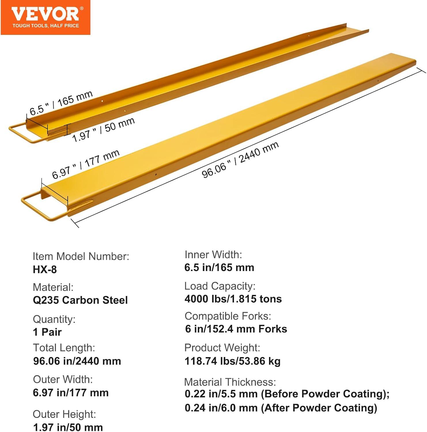 VEVOR Forklift Extensions, 96 Inch Pallet Fork Extensions 6.5 Inch Width, Heavy Duty Fork Extensions for Forklifts, 1 Pair Forklift Extensions for Forklift Truck(96 x 5.5 Inch)