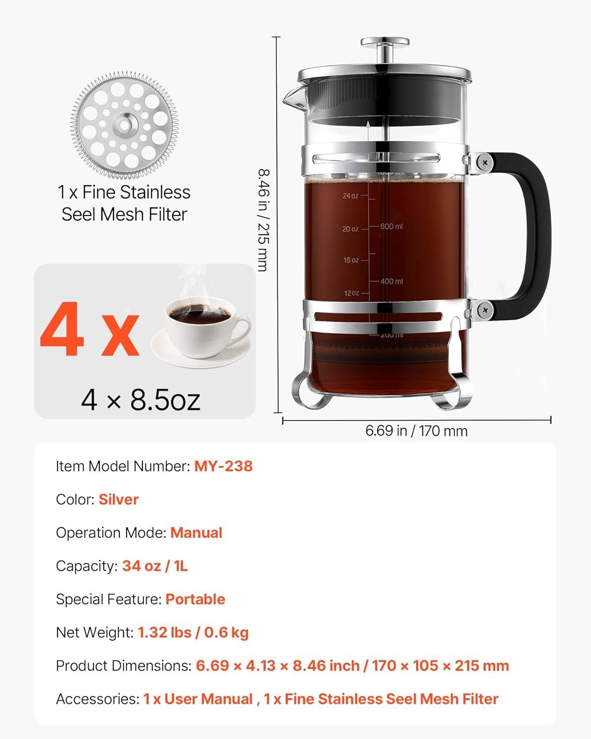 VEVOR French Press Coffee Maker, 34 Ounce 1 Liter Borosilicate Glass Coffee Press Tea Maker with Stainless Steel Filter, Large Glass French Presses Cold Brew for Camping Travel Home Kitchen, Silver(Silver)