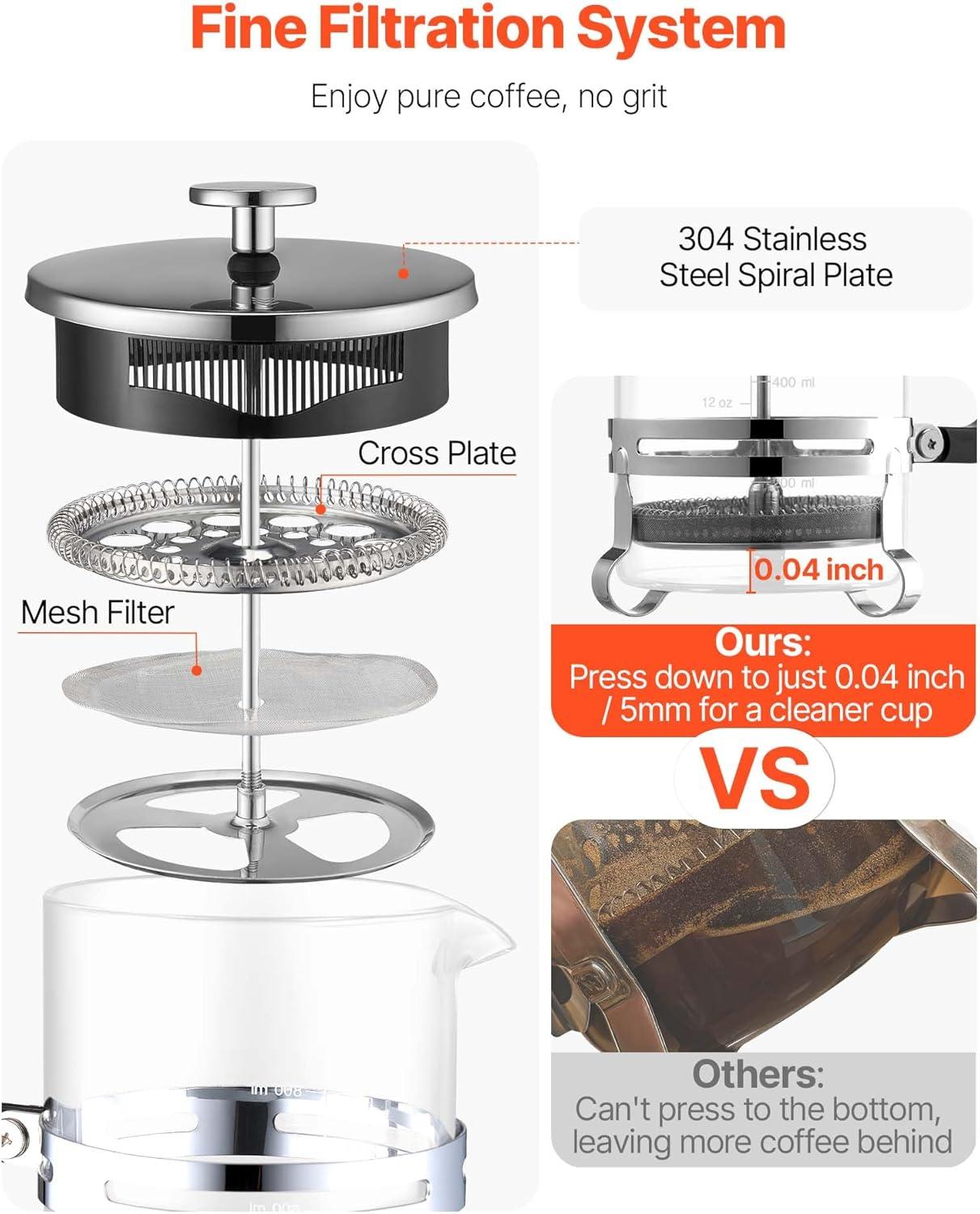 Precision Filtration System: Our coffee press features a fine filtration system with a 304 stainless steel spiral plate, mesh filter, and cross plate. It effectively removes coffee grounds for a smooth taste