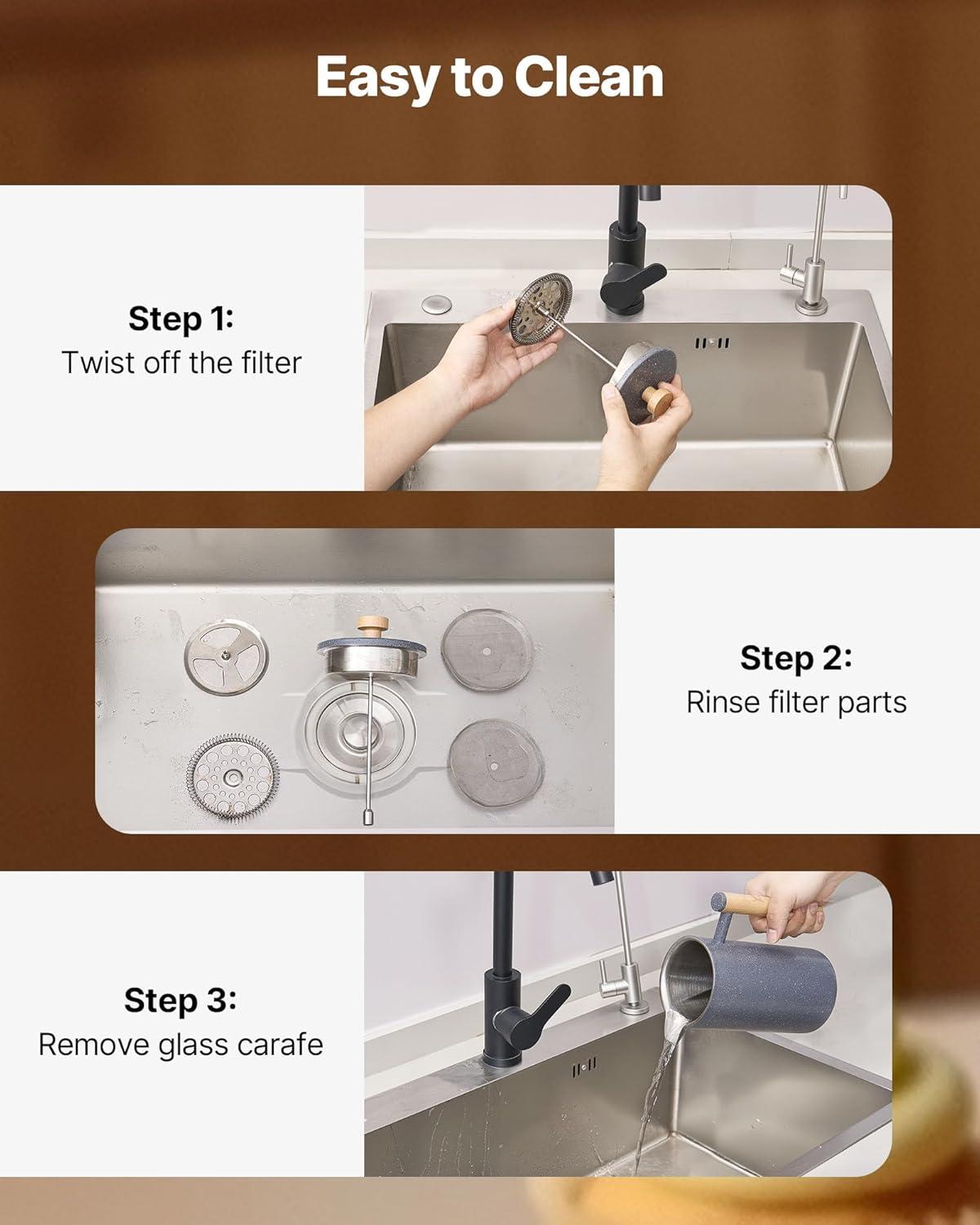Easy to Clean: This French coffee press features a smooth stainless steel surface, removable filter and plunger for effortless cleaning. All parts disassemble easily for deep cleaning and are fully dishwasher-safe