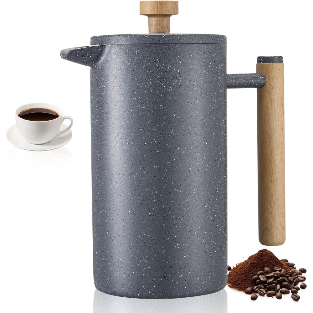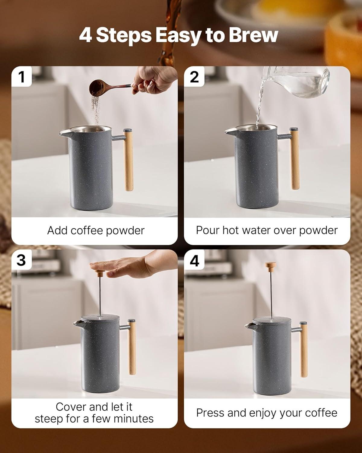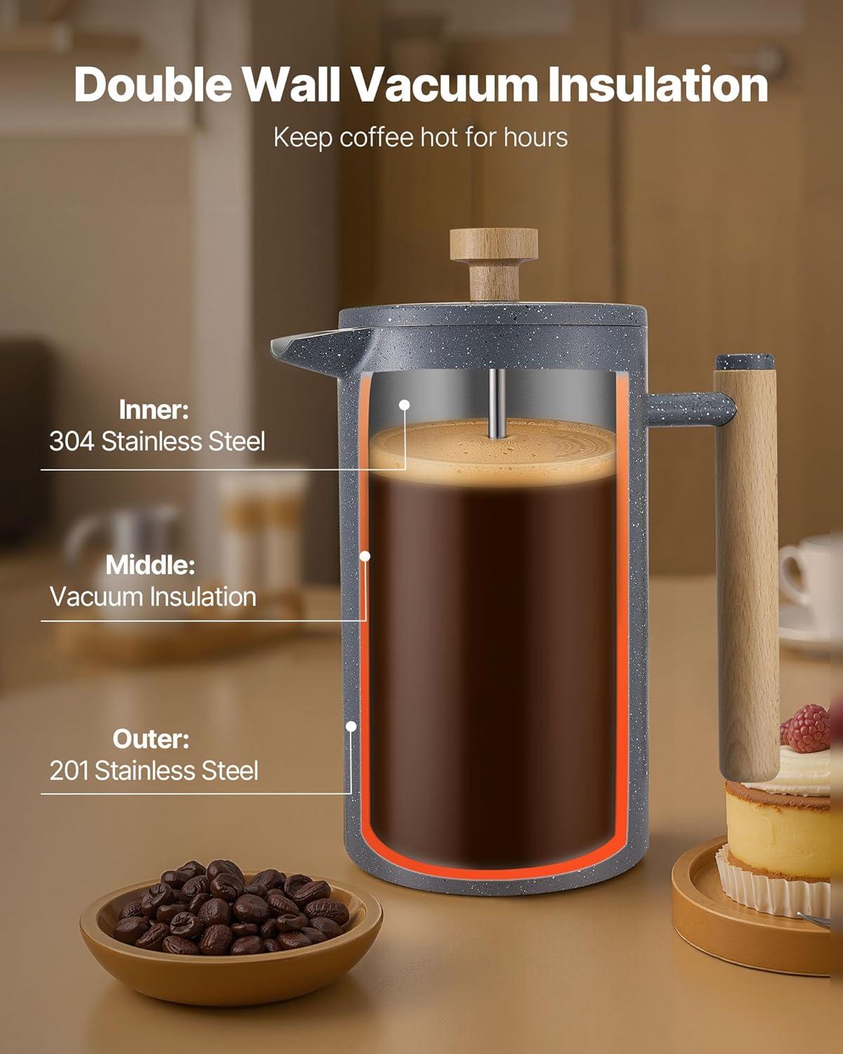 Double-Wall Insulated Stainless Steel: The French press coffee maker is crafted from food-grade 304 stainless steel—corrosion-resistant, rustproof, and durable. Its double-wall vacuum insulation keeps coffee hot and the exterior cool to the touch