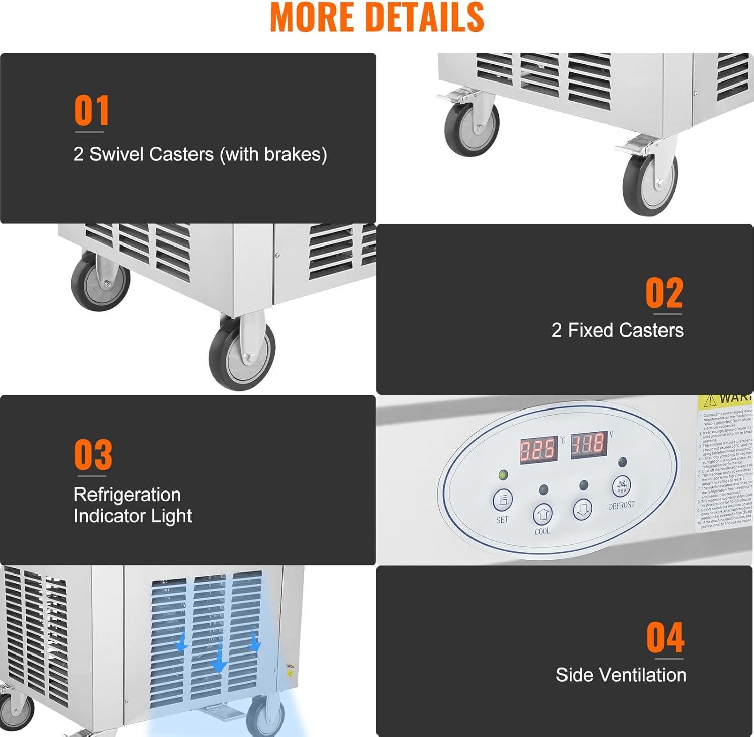 Refrigeration Indicator and Adjustable Temp: The fried ice cream machine is equipped with a refrigeration indicator light. When the set temp is not reached, the corresponding indicator light remains on continuously; when the set temp is reached, the light flashes, indicating that it is ready for operation. Plus, the temp sensor can be adjusted within the range of -40 to 50°C / -40 to 122°F. Intelligent temp control ensures energy efficiency.