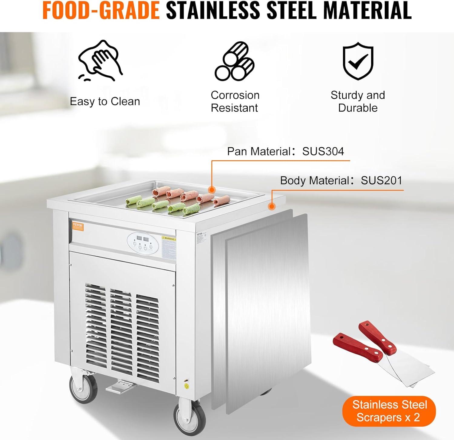 Stainless Steel Construction: The food-grade SUS304 stainless steel for the ice cream pan and SUS201 stainless steel for the exterior ensure rust resistance and corrosion prevention, making it easy to clean.
