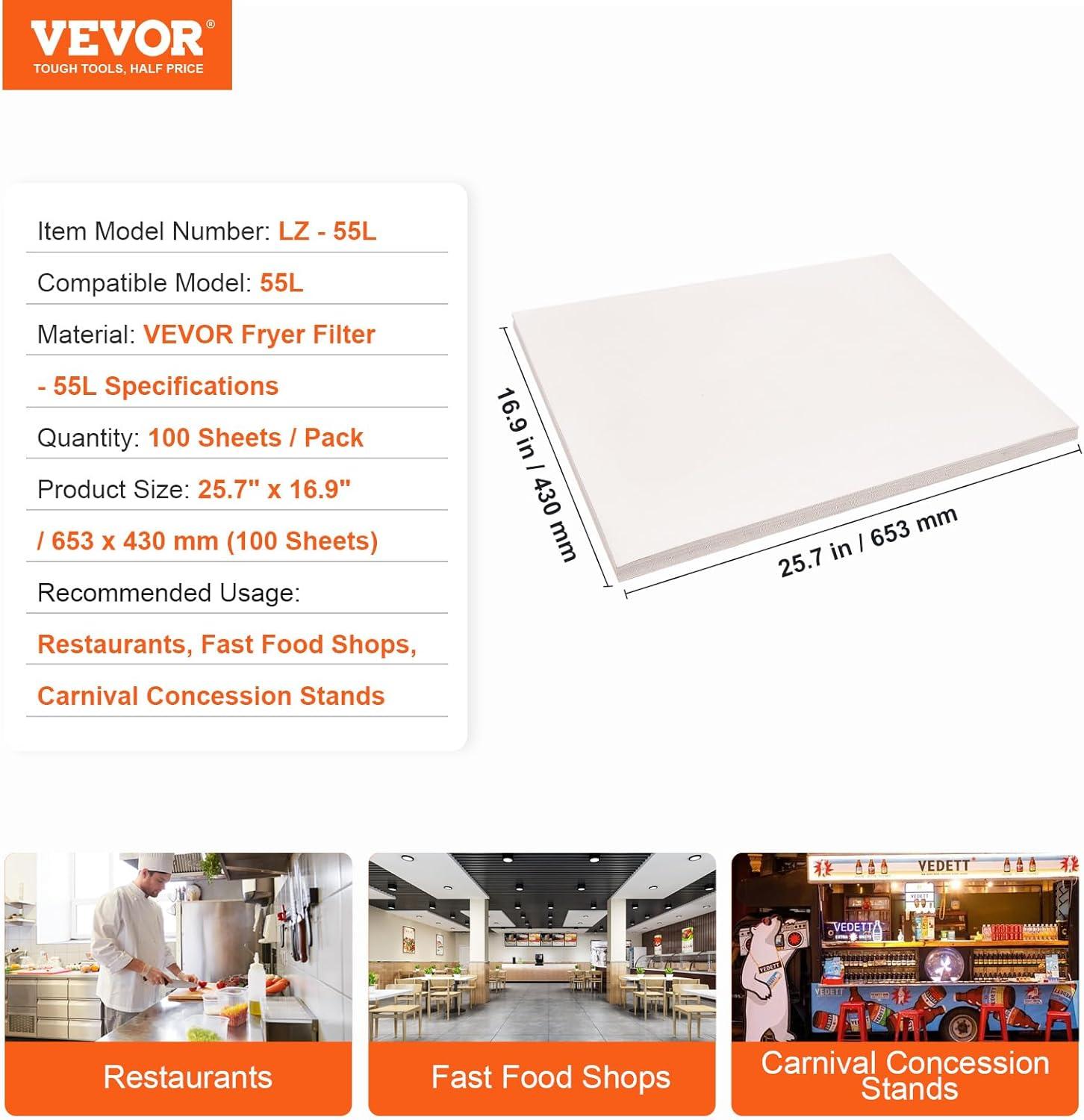 Get 100 Sheets of Filter Paper Included: You will receive 100 sheets of fryer filter paper with dimensions of 25.7″ x 16.9″/653 x 430 mm. The paper is a perfect fit for VEVOR Mobile Fryer Filters – 55L specifications.