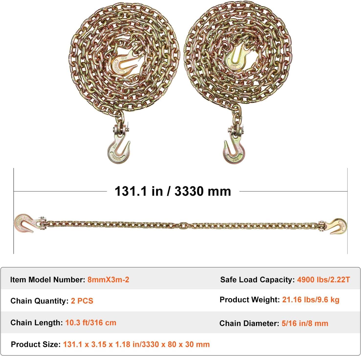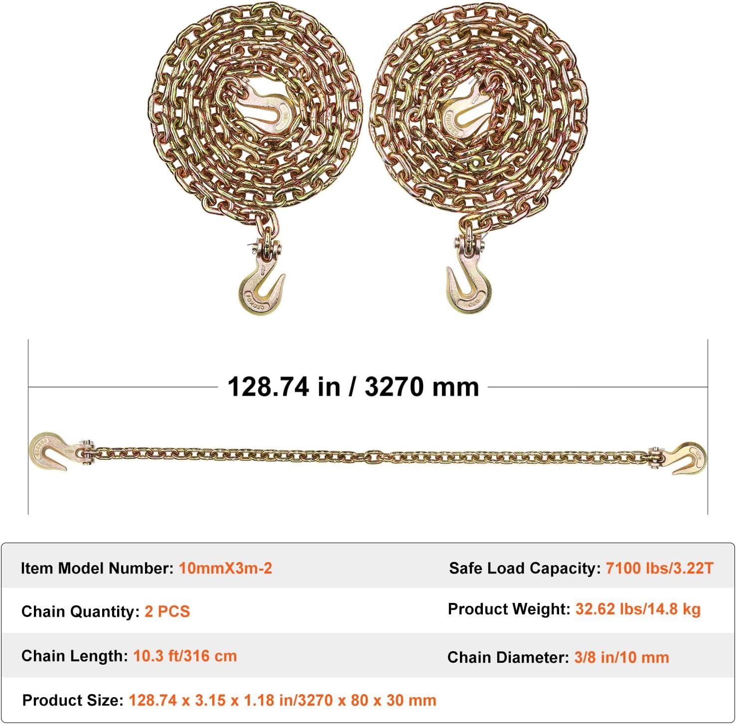 VEVOR G80 Transport Binder Chain, 3/8″ x 2.9′ 2-Pack Tow Chain with Clevis Snap Hook, 7100 lbs Safe Working Load, Heavy Duty Logging Chain for Transporting Towing Truck Tie Down Binding Equipment(1 Pack)